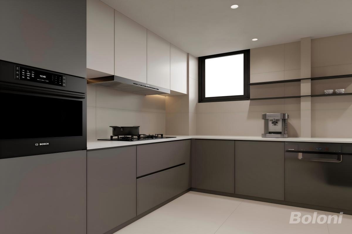 以低饱和度的灰、米白中性色系为主,搭配哑光质感的橱柜饰面(深灰下柜、浅灰上柜),营造出冷静、克制的视觉效果;台面采用白色石材,与墙面浅米色瓷砖形成层次,材质统一且无多余装饰,体现 “少即是多” 的极简哲学。