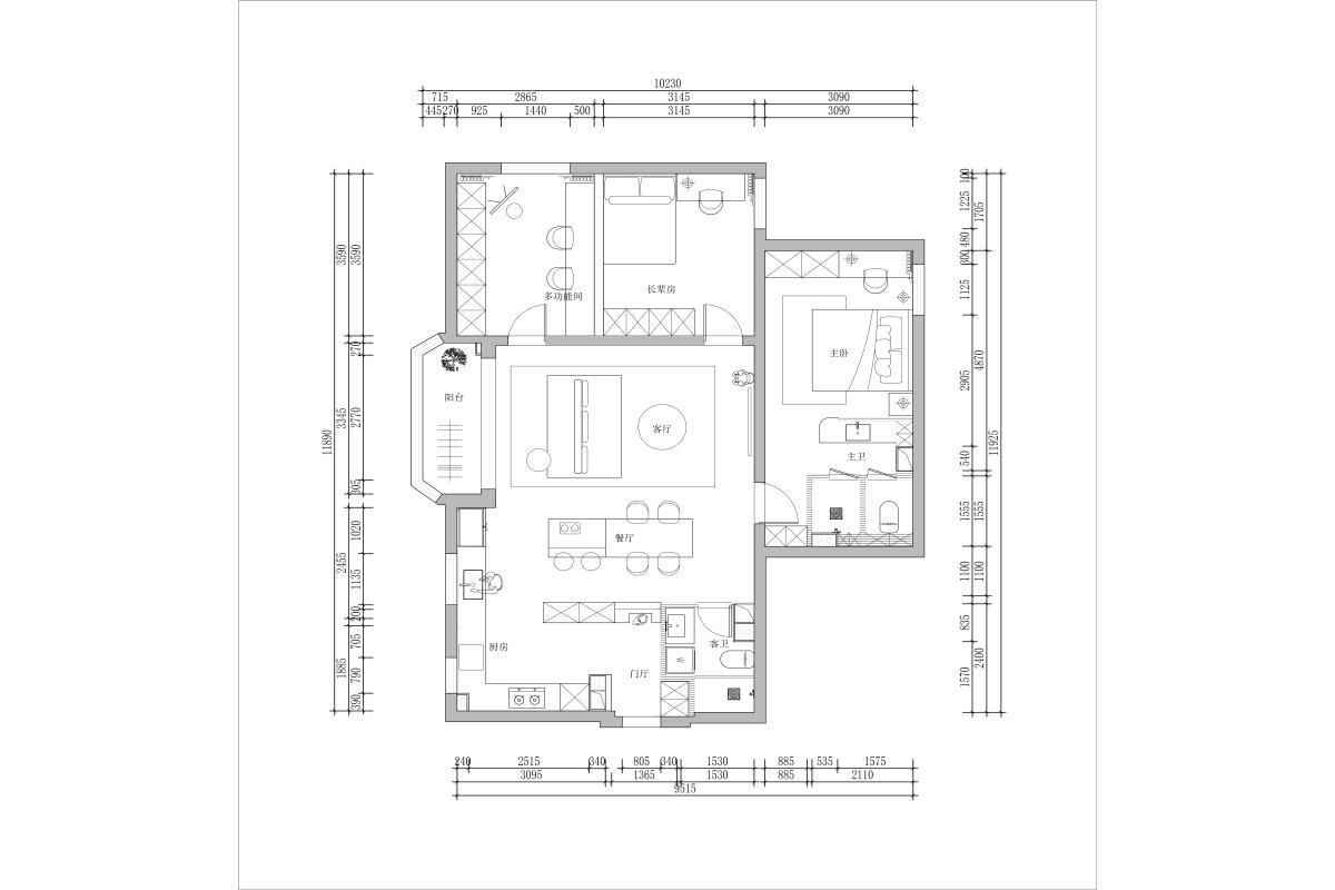 以黑白灰中性色系为主,通过不同灰度的层次(浅灰墙面、深灰厨房柜体、米白沙发)营造出简洁、克制的视觉效果,无多余跳色,传递出冷静且高级的质感。客餐厨采用开放式一体化设计,打破功能区的物理边界,让空间更显开阔通透;无主灯设计(线性灯带、嵌入式筒灯)进一步强化了空间的延伸感,减少视觉压迫。