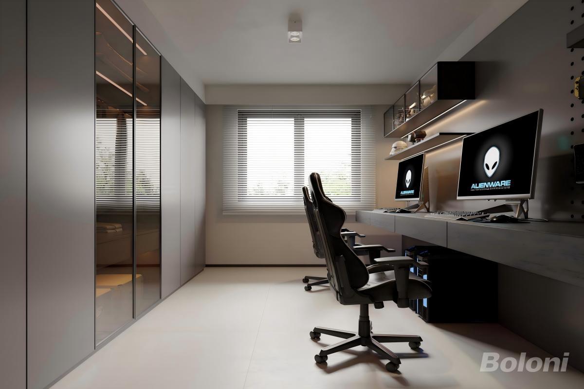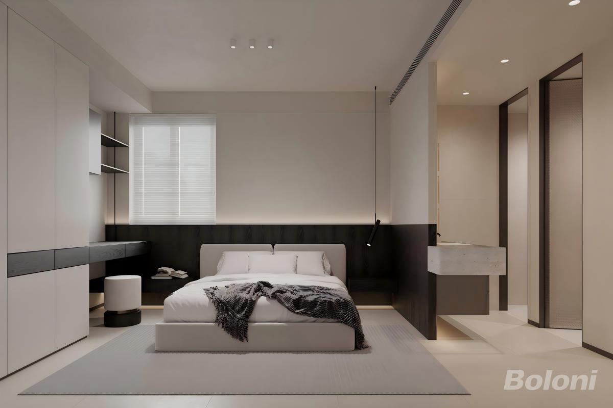 以黑白灰中性色调为主,通过深灰木质床头背景、浅灰柜体、白色床品的层次搭配,营造出冷静克制的视觉效果;材质上运用哑光饰面(如衣柜、书桌)、木质元素(床头背景),搭配简洁的金属线条(如悬浮台盆的黑色边框),在极简中融入细腻的质感。