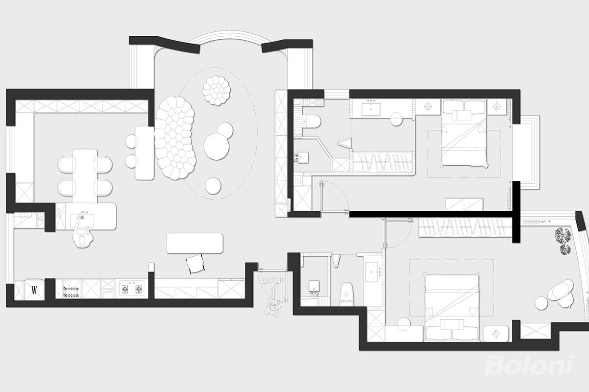 此次设计布局中,公共区域与私密卧室区域相对独立,动线设计考虑到整体的灵活性,保证了家庭活动的互动性又兼顾了居住的私密性,整体设计简约而不简单,在功能与美学的平衡中,诠释了现代极简风格 “简致不凡” 的居住理念。