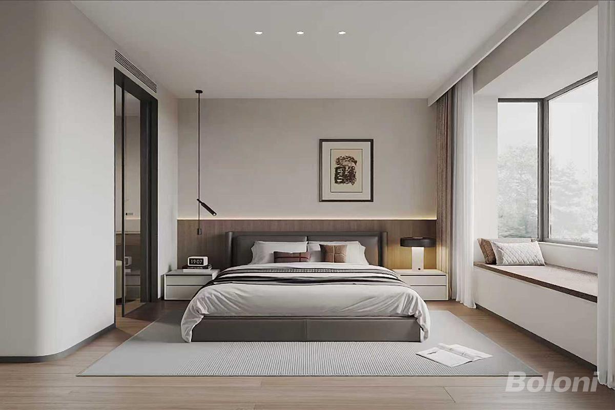 主卧采用动静分区,睡眠区(床)与休闲区(飘窗)功能明确,左侧玻璃门连通卫浴和衣帽间,颜色以淡色系为主,营造宁静柔和的睡眠氛围,材质融合艺术墙面、木质地板、皮质床具,提升视觉层次营造温馨氛围,诠释了 “舒适与美学共生” 的卧室设计理念