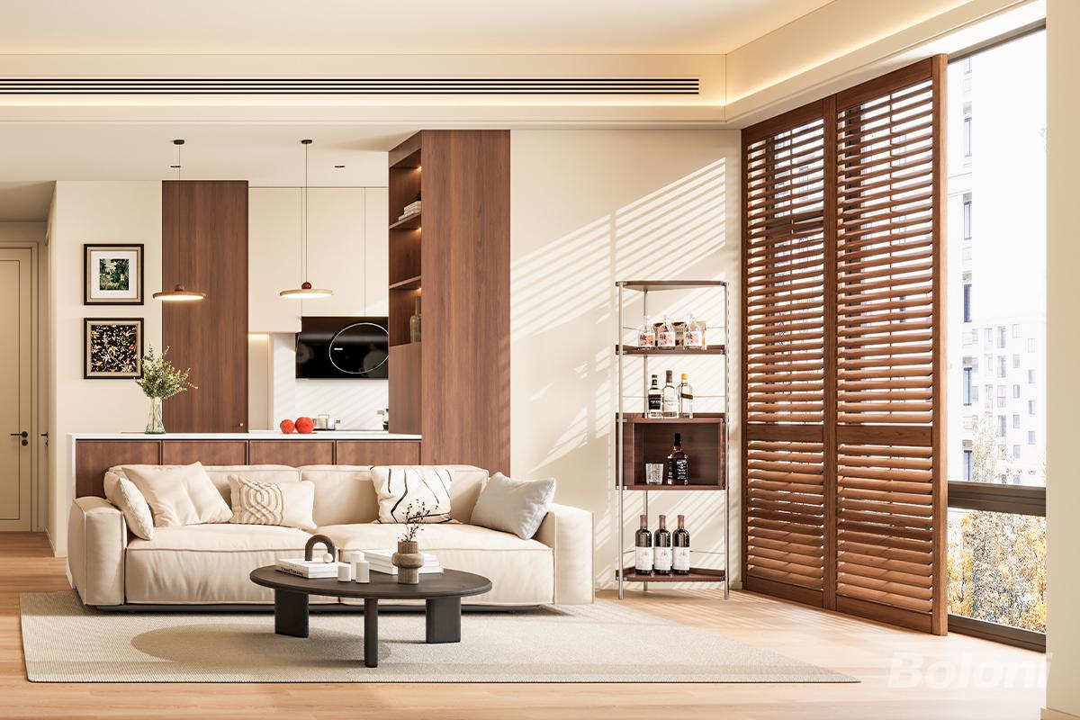 该客厅设计以现代简约风格为基调,融合自然元素与精致细节,营造出舒适雅致的生活空间。 - 空间布局:采用开放式格局,保证空间通透感,木质百叶窗引入自然光线的同时兼具隐私性; - 色彩搭配:米白墙面与原木色家具形成柔和底色,黑色茶几、金属支架等深色元素点缀,增强视觉层次; - 材质运用:木质柜体传递温润质感,哑光墙面与光滑柜体形成材质对比,提升空间质感; - 软装细节:花卉挂画、艺术雕塑提升艺术氛围