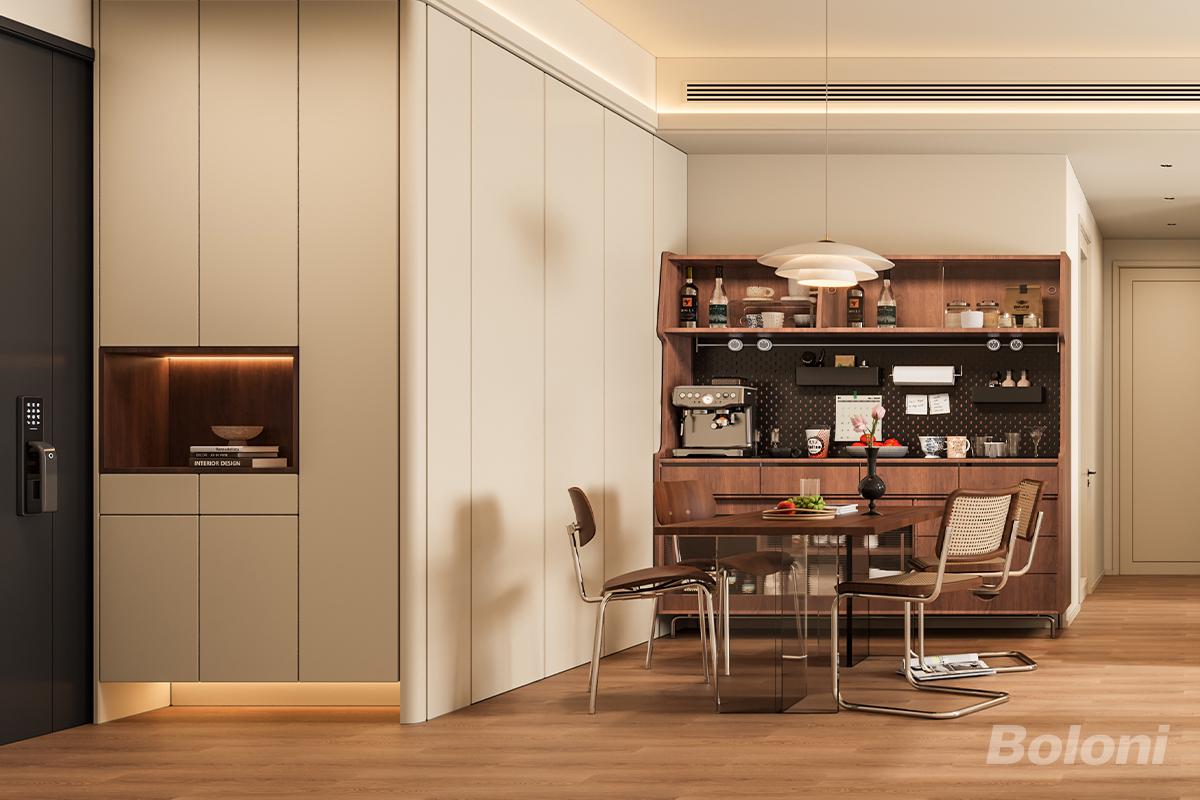本空间为餐厅与收纳区一体化设计,以现代简约+轻复古为风格核心,打造出了实用与美学兼具的生活场景。 - 空间布局:开放式布局增加强通透感,左侧一体化柜体实现收纳功能,右侧餐区与备餐柜联动,提升使用效率的同时。 - 色彩搭配:米白墙面+原木色家具奠定柔和基调,黑色金属、深色柜体形成视觉对比,层次丰富; - 材质运用:木质餐柜传递温润质感,藤编椅面+金属椅架、玻璃桌面+金属支架,融合复古与现代元素;
