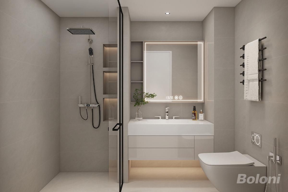 本卫生间设计以现代简约风格为主,追求简洁实用与精致质感的平衡。 - 空间布局:采用干湿分离设计,玻璃隔断划分淋浴区与洗漱、如厕区,提升空间利用率与使用便利性。 - 色彩搭配:以浅灰色瓷砖为基调,搭配白色洁具,营造出干净、柔和的视觉效果,整体氛围静谧舒适。 - 材质运用:墙面地面选用哑光质感的浅灰瓷砖,易清洁且显高级;玻璃隔断通透轻盈,增强空间通透感。 - 细节设计:带灯镜柜兼具了照明与收纳功能。