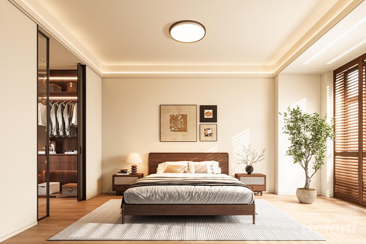 本卧室设计以现代简约风格为核心,融合自然元素,打造舒适静谧的休憩空间。 - 空间布局:床居中心,两侧床头柜对称分布,左侧开放式衣柜增强收纳与空间通透感,右侧百叶窗引入自然光线。 - 色彩搭配:米白墙面搭配原木色家具,浅灰床品与条纹地毯中和暖调,营造柔和温馨氛围。 - 材质运用:木质床具、地板传递温润质感,藤编床头柜增添自然肌理,玻璃衣柜门提升空间轻盈感。 - 细节设计:三幅装饰画丰富了墙面层次。
