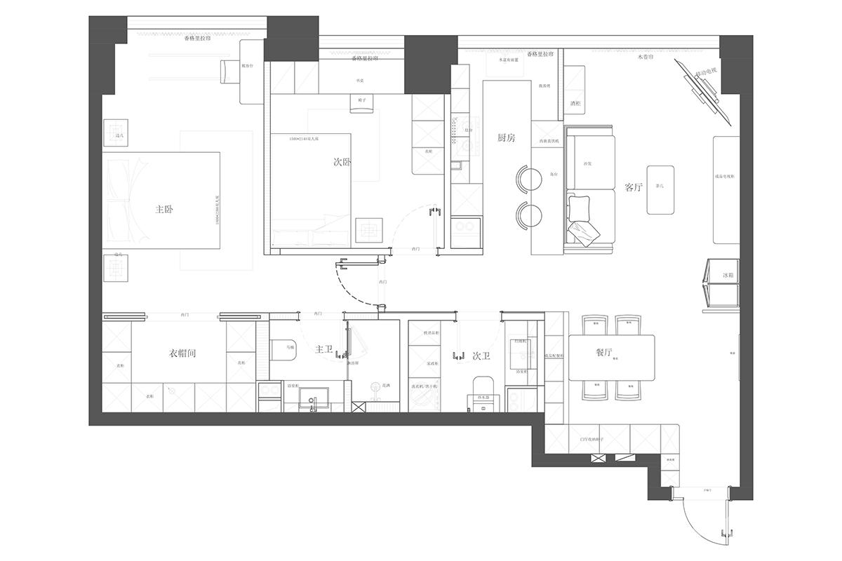 本住宅平面设计遵循“功能分区、动线流畅、空间高效”原则,打造舒适宜居的现代居所。 - 空间布局:采用动静分区设计,主卧、次卧等静区集中于西侧,客厅、餐厅、厨房等动区布局东侧,减少干扰。 - 功能规划:主卧带独立衣帽间、主卫,保障私密性;次卧紧邻公区,兼顾便捷与安静;双卫生间设计满足家庭需求。 - 动线设计:入户即达餐厅、客厅,厨房与餐厅动线短捷,家务动线(厨房 - 次卫 - 洗衣区)与居住动线(