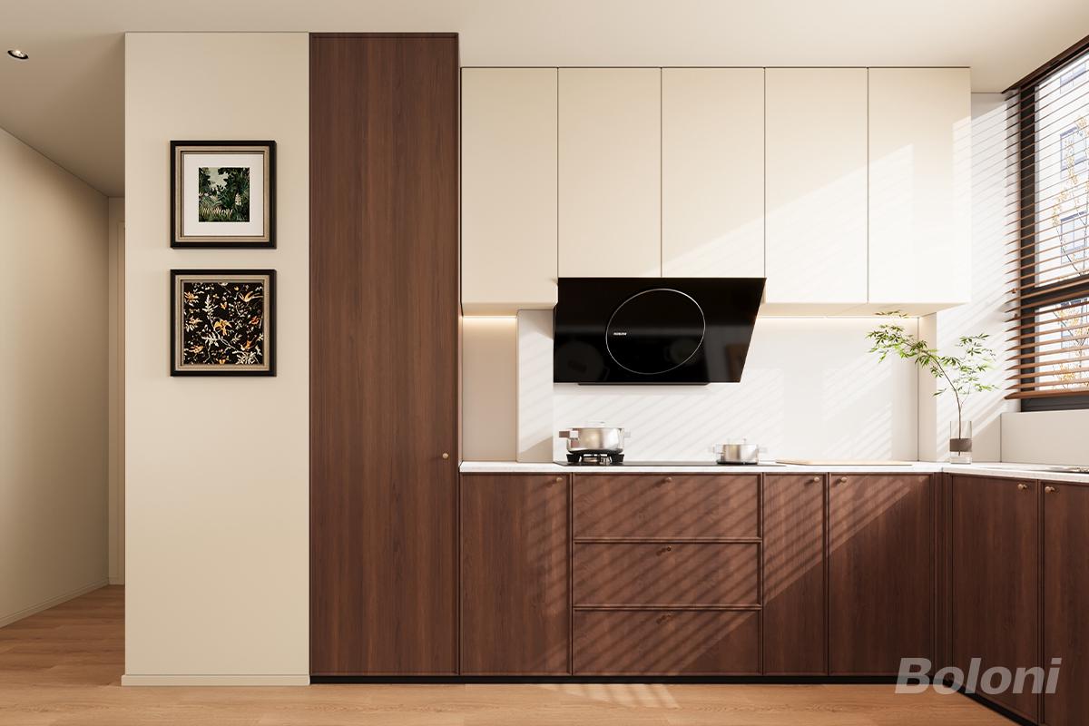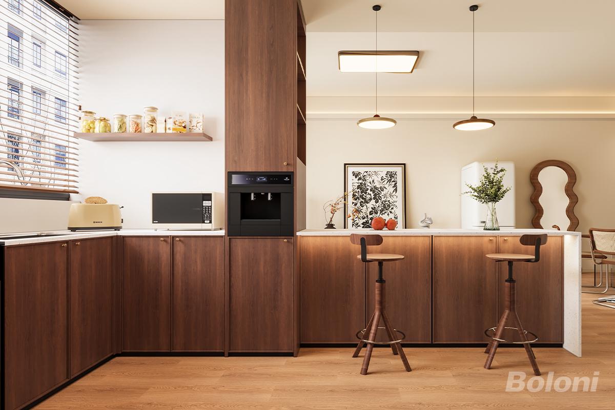 本厨房设计以现代中古为核心,通过材质、色彩与细节的巧妙搭配,打造出兼具美观与实用的烹饪空间。 - 色彩与材质:采用浅米白色吊柜与深棕色实木地柜形成视觉对比,搭配原木色地板,营造出温暖柔和的空间氛围。墙面运用素色哑光材质,增强空间的整洁感。 - 功能布局:吊柜与地柜的组合提供充足收纳空间,黑色弧形油烟机简约大气,与整体风格协调统一。灶台区域的灯光设计,既满足烹饪照明需求,又增添了空间层次感。 -