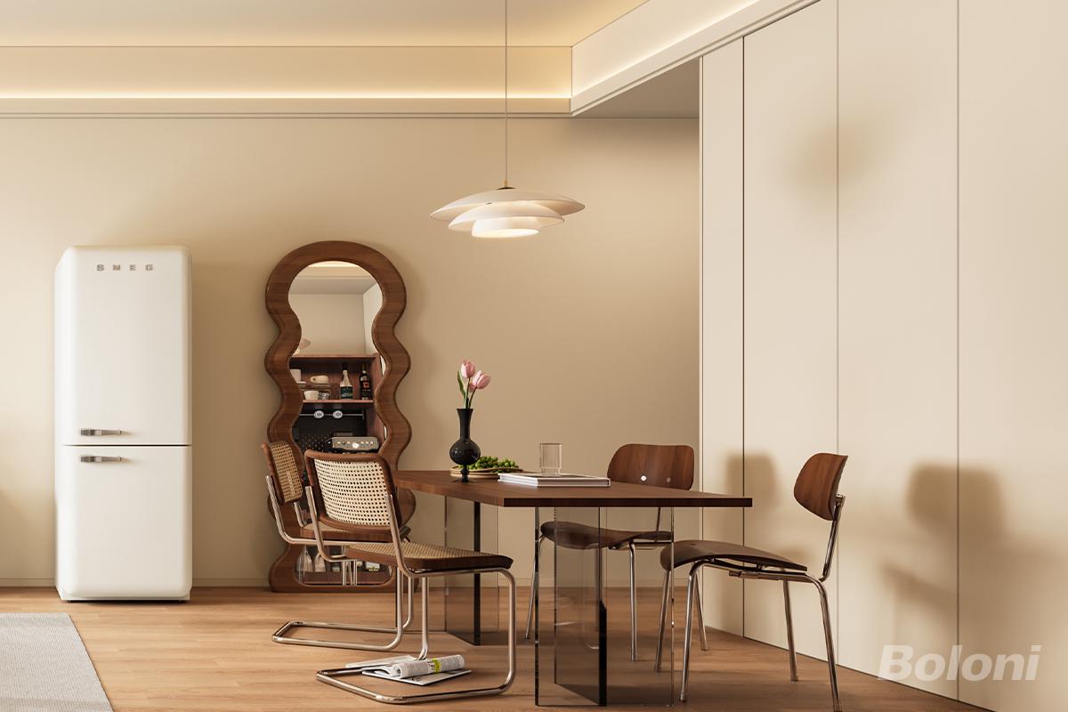 本餐厅设计以现代中古风格为核心,融合复古与自然元素,打造舒适雅致的用餐场景。 - 空间布局:开放式布局增强通透感,与厨房、客厅区域自然衔接,提升空间利用率; - 色彩搭配:米白墙面搭配原木色家具,辅以黑色金属支架,形成柔和且富有层次的色彩体系; - 材质运用:木质餐桌传递温润质感,藤编椅面与金属椅架结合,复古冰箱与艺术镜增添了细节趣味; - 软装细节:黑色花瓶、粉色花卉、绿色果盘形成了色彩对比。