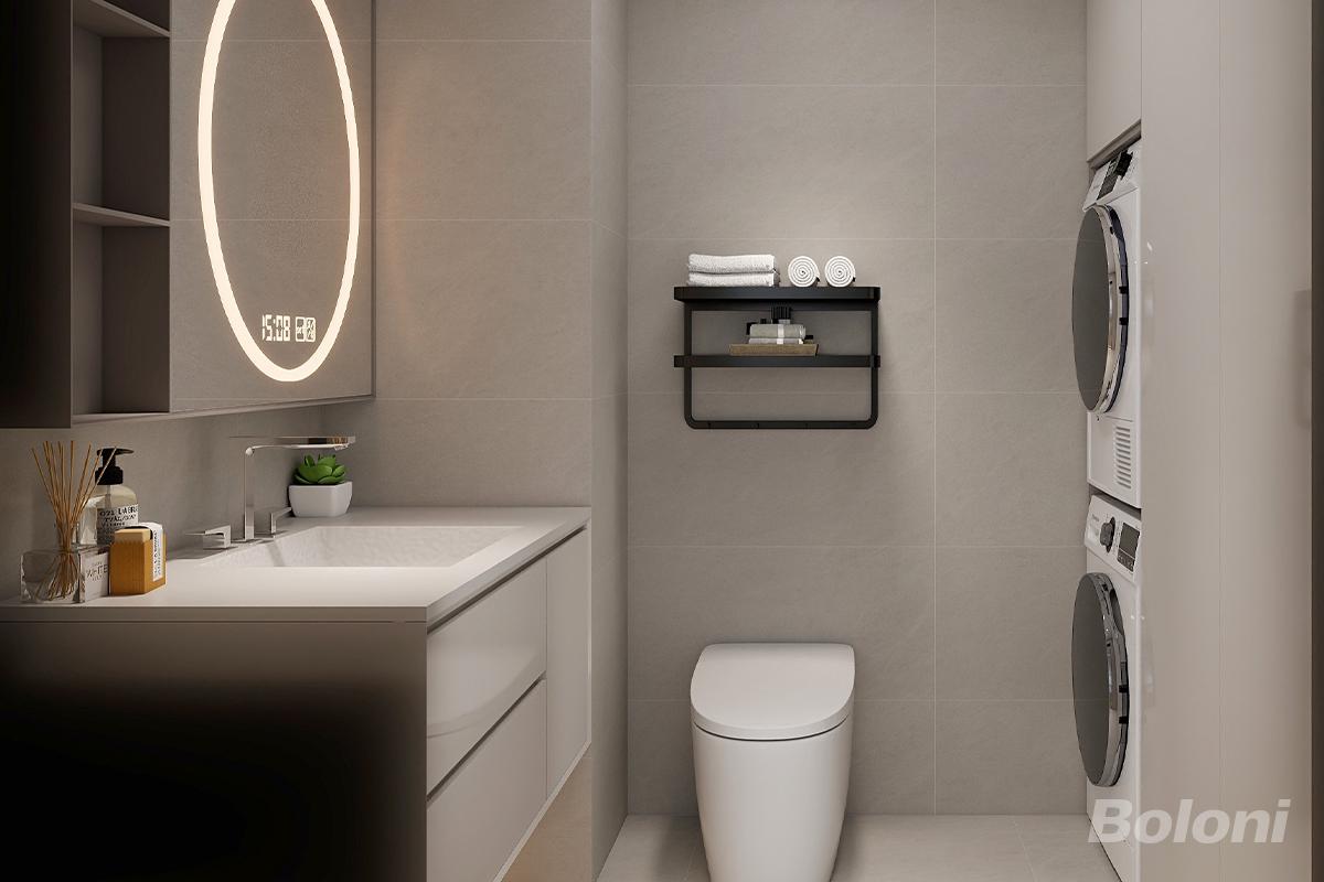 本卫浴空间采用现代简约风格,以浅灰调瓷砖打造柔和底色,营造出静谧舒适的氛围。 - 功能布局:洗漱区、如厕区与洗衣区紧凑有序,嵌入式柜体与叠放式洗衣机充分利用垂直空间,满足日常收纳与洗衣需求; - 细节设计:带灯光与时间显示的圆形镜柜,兼具照明、梳妆与储物功能;黑色置物架以对比色提亮空间,绿植、香薰等软装增添生活气息; - 材质运用:光滑的台面、哑光的瓷砖与简洁的柜体线条,传递出了精致利落的质感。