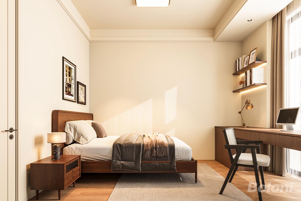 本卧室采用中古风,以柔和的米白墙面搭配原木色家具,营造出温馨舒适的休憩氛围。 - 功能布局:睡眠区与学习工作区动静分区,床具居中摆放,书桌紧邻窗边,兼顾采光与使用便利性; - 细节设计:床头挂画、墙面置物架丰富空间层次,暖光台灯与射灯营造柔和光影;床品以米白为底,搭配深棕床尾毯,通过色彩对比提升视觉质感; - 材质运用:木质家具传递自然温润感,浅灰地毯柔化空间,窗帘与床品材质呼应,整体风格新颖。