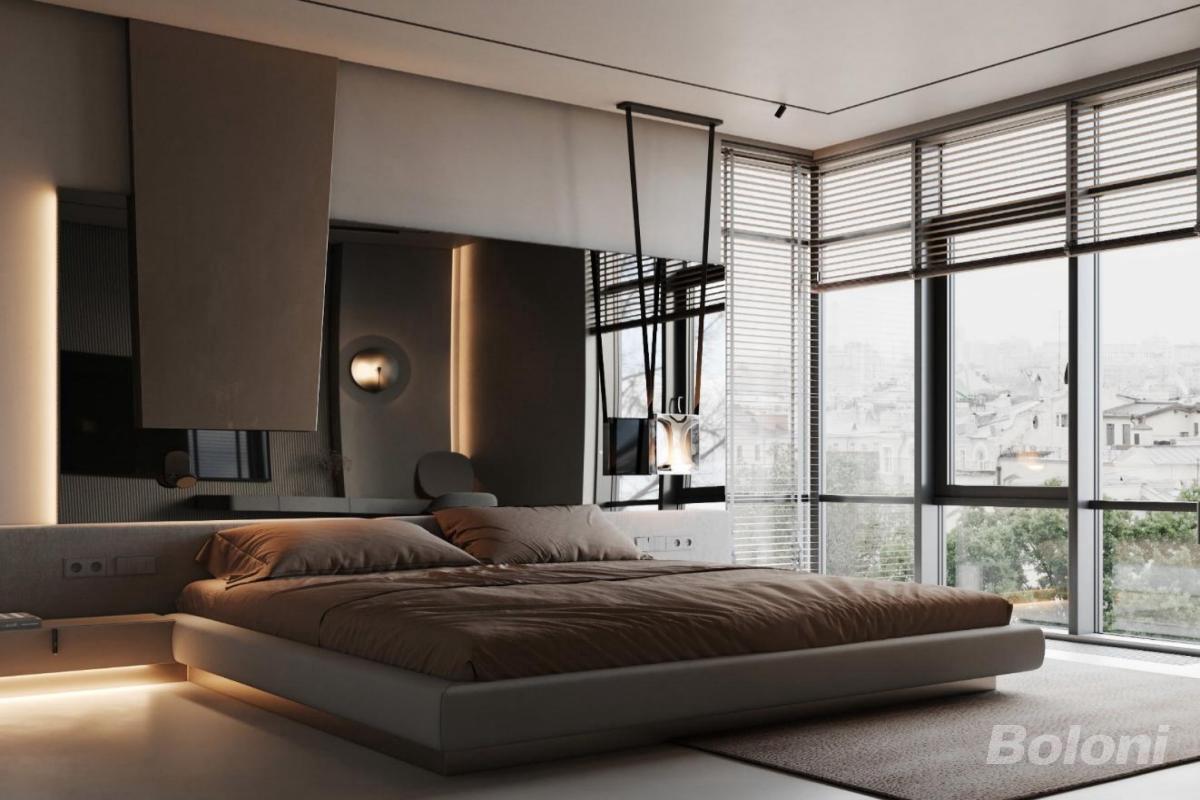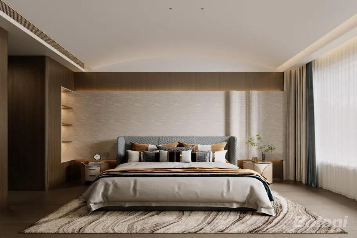 本卧室以轻奢风打造,深棕与浅灰主调营造高级感。悬浮床搭配嵌入式灯光,精致且具设计感。大窗与金属线条灯具点缀,平衡 “轻” 的简约与 “奢” 的质感,光影交错间尽显优雅舒适的品质休憩空间。