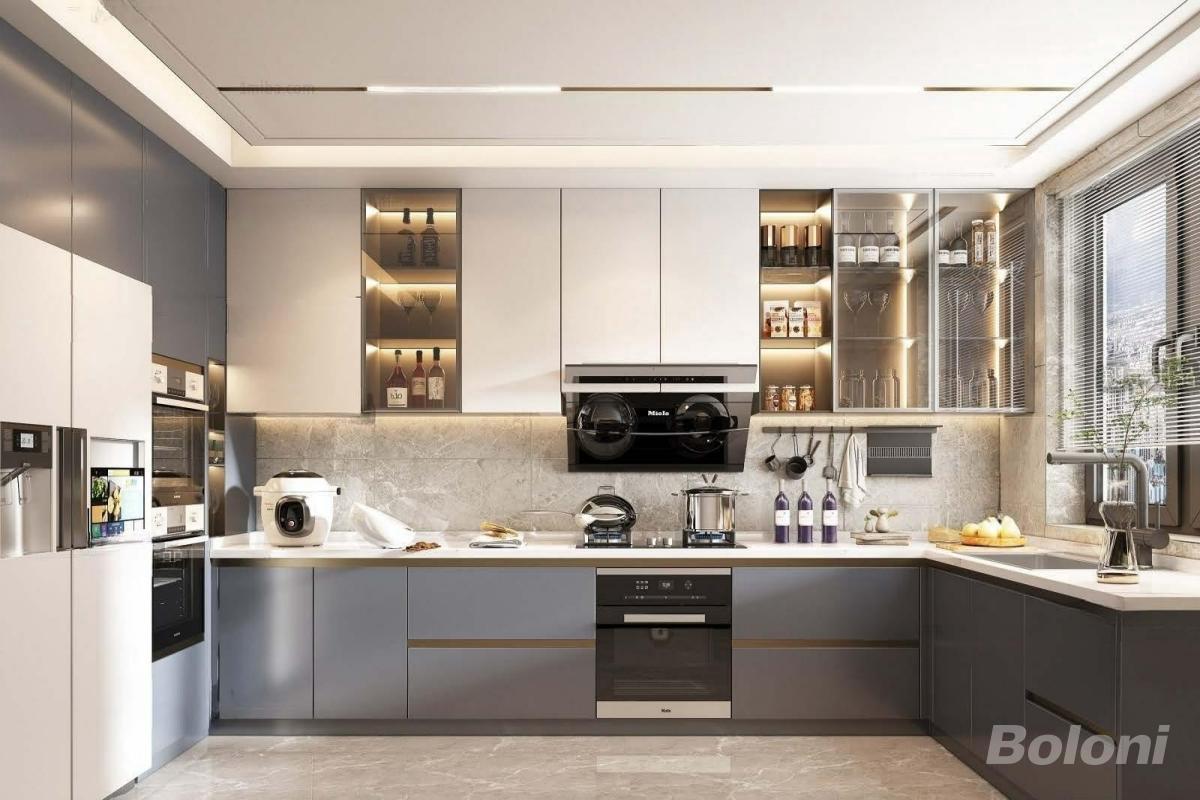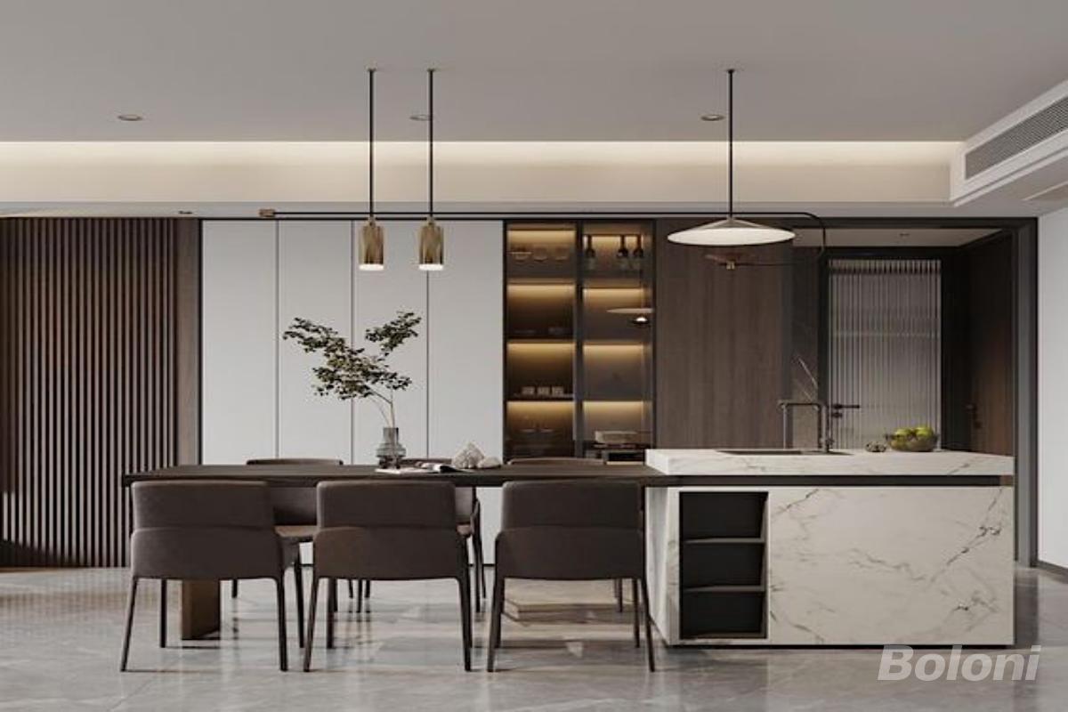 本餐厨空间以轻奢风呈现,深棕与米白主调搭配大理石岛台,质感高级。金属吊灯、带灯玻璃柜点缀精致细节,木质元素增添温暖,绿植与简约家具平衡 “轻” 的雅致与 “奢” 的质感,打造出优雅实用的品质餐厨空间。