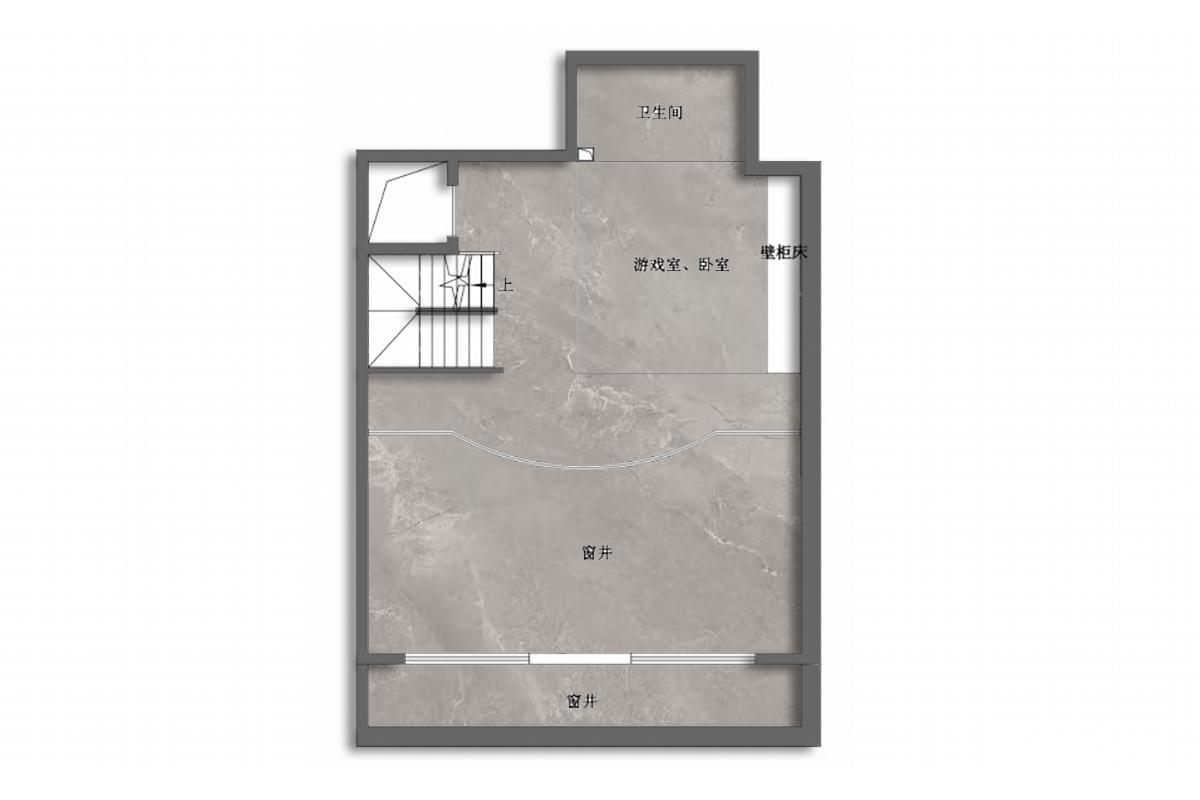 该负一层户型以 “多功能弹性空间” 为核心,设游戏室 / 卧室双用区,搭配壁柜床实现空间复用;双窗井强化采光,卫生间保障便利,楼梯衔接上层动线,既满足休闲娱乐,也可灵活切换为临时起居区,适配多元需求。