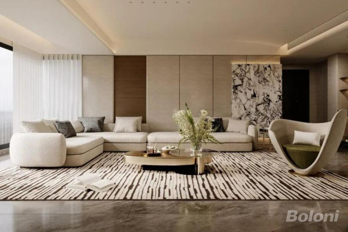 本客厅以轻奢风打造,米白主调搭配大理石电视背景墙,尽显高级质感。金属茶几、造型独特的单人椅融入精致细节,黑白条纹地毯丰富层次,灯光与花艺点缀,平衡 “轻” 的简约与 “奢” 的精致,营造优雅舒适的品质空间。