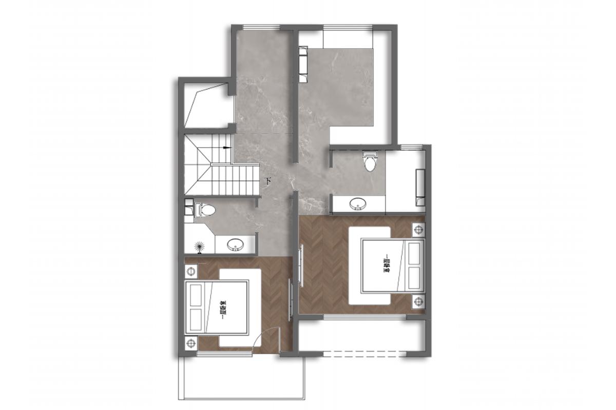 该下层户型以 “双卧 + 双卫” 布局打造私密起居区,双卧室适配亲友留宿,双卫浴提升使用效率,公区衔接楼梯动线,空间分区清晰。整体兼顾居住私密性与功能实用性,可作为家庭客房层或独立休憩空间,适配多元居住需求。