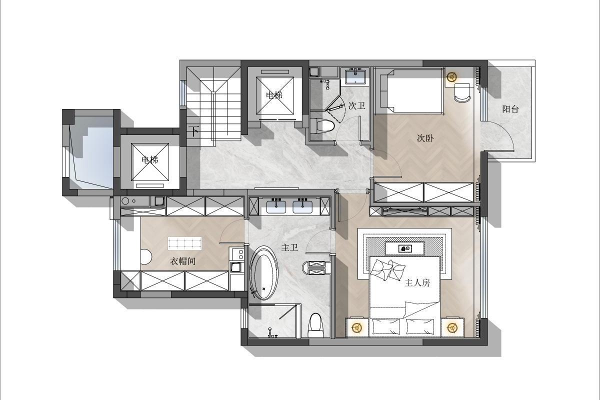 本户型轻奢设计聚焦 “私密领域的雅致奢享”,主人房与衣帽间、主卫形成奢适动线,以高级木饰面、金属线条勾勒精致轮廓,主卫浴缸与双台盆设计暗藏细节,在起居空间中融入低奢质感,诠释专属的精致生活仪式感。