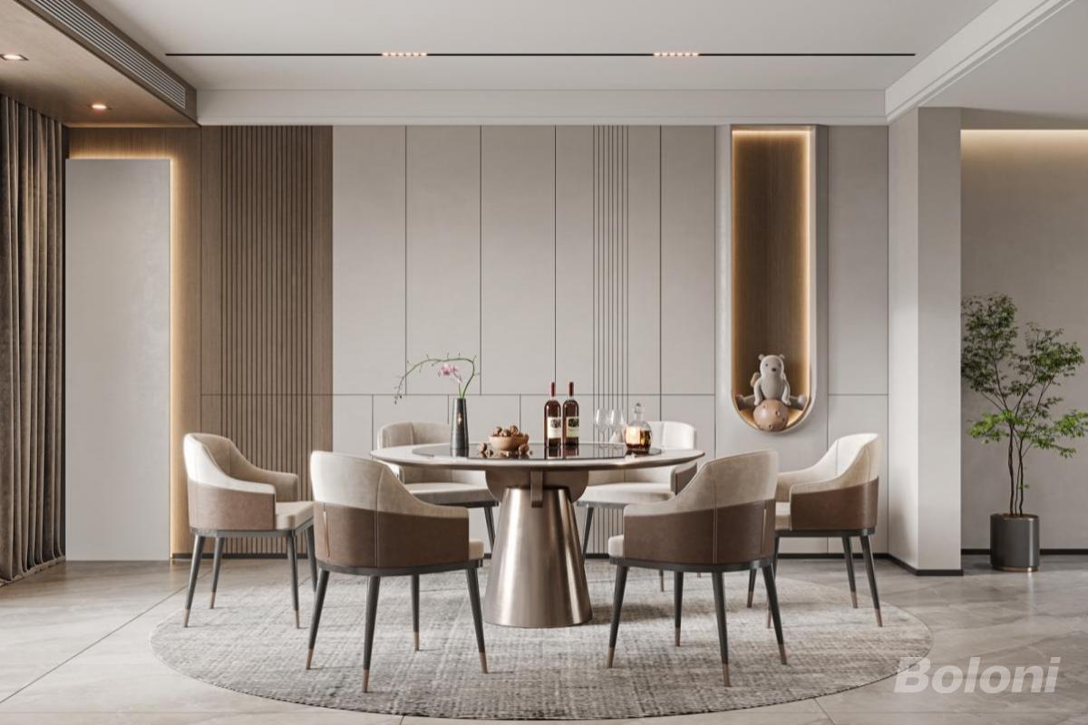 本餐厅以暖棕调构建优雅基底,金属圆桌的冷冽与皮革座椅的温润碰撞,墙面竖纹、嵌入式灯带与壁龛柔光层叠层次。对称布局串联精致细节,光影晕染间,于简约形制中凝萃轻奢质感,诠释从容考究的用餐氛围 。