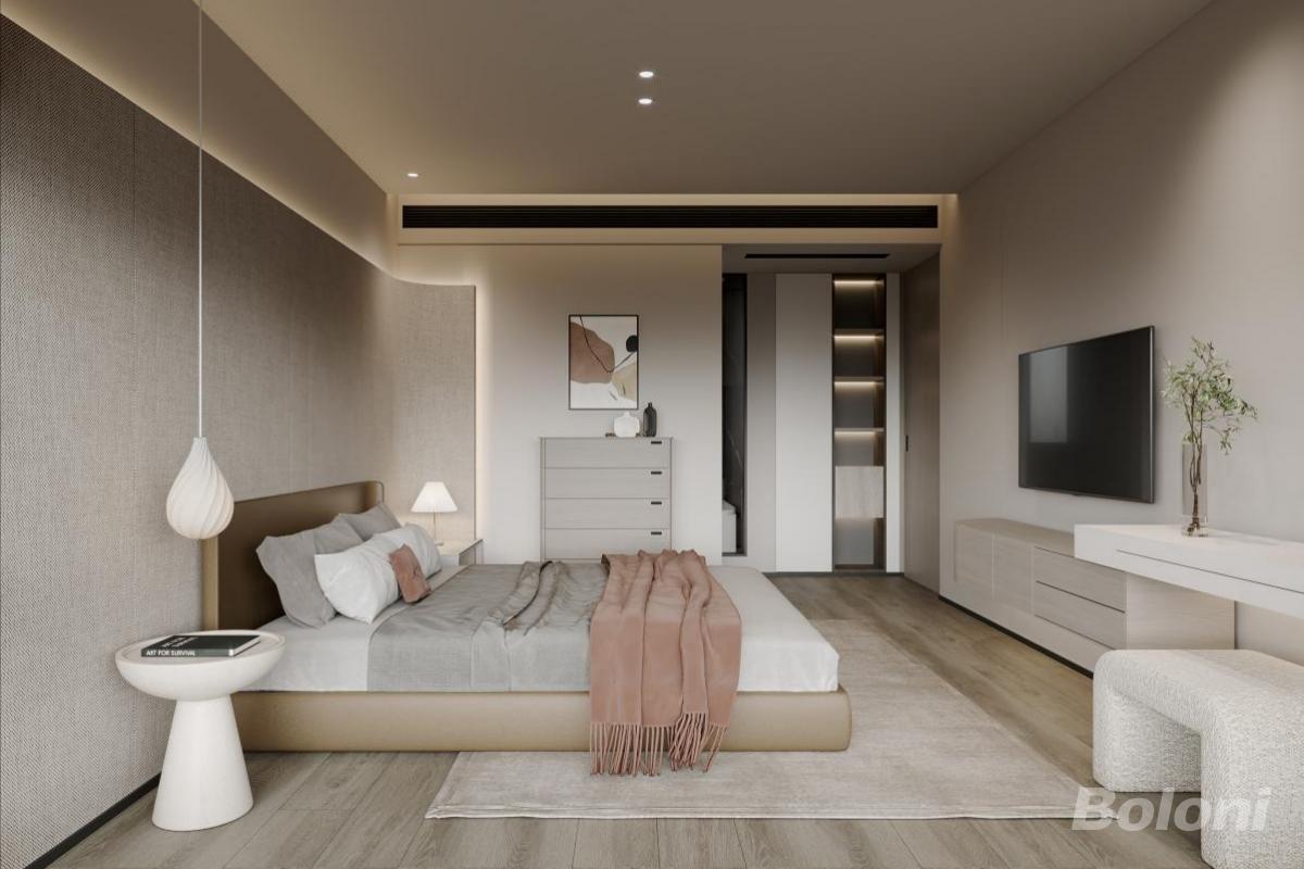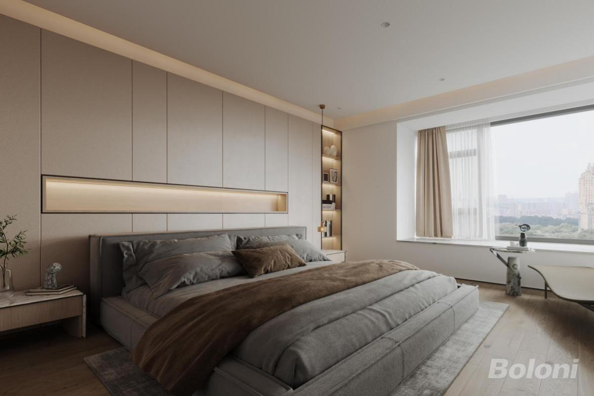 本卧室轻奢设计以 “静谧奢雅的休憩场域” 为核,柔和中性色调铺陈基底,绒面床具与质感墙面细腻呼应,定制线性灯光与展示柜暗藏精致巧思,大窗引自然光入户,于简约布局中通过材质、光影的精准把控,演绎专属私密的轻奢起居质感。
