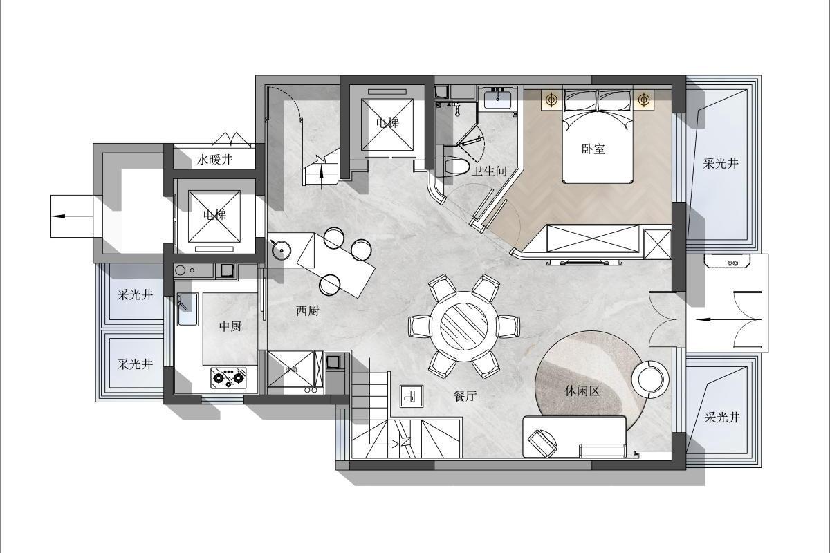 本户型轻奢设计聚焦 “餐厨社交的精致质感”,中西厨与餐厅、休闲区构建互动场域,多采光井引自然光入户,以高级石材与金属细节细腻碰撞,于功能布局中暗藏轻奢巧思,演绎兼具烟火气与格调的精致生活范式。