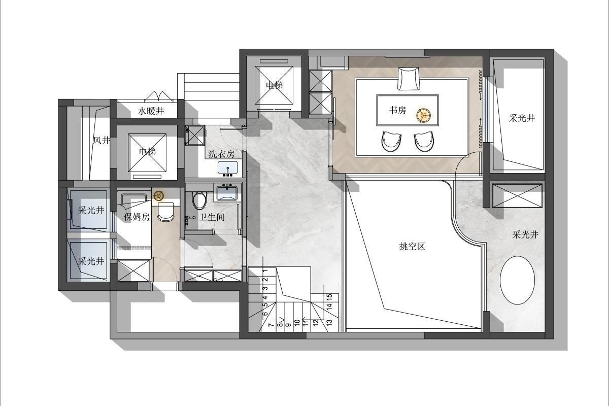 本户型轻奢设计以 “光与质的雅致共鸣” 为核,借多采光井引入充沛自然光,衬以高级石材与金属线条的细腻碰撞。书房打造精致静谧的格调场域,挑空区通过比例拿捏彰显大气,各功能区在实用中暗藏轻奢巧思,以低饱和质感与精致软装,演绎不彰自显的高阶生活美学。