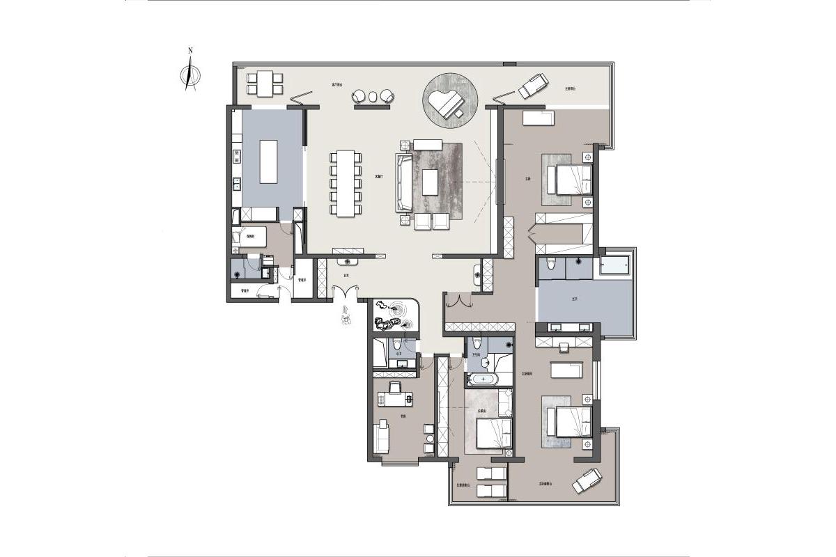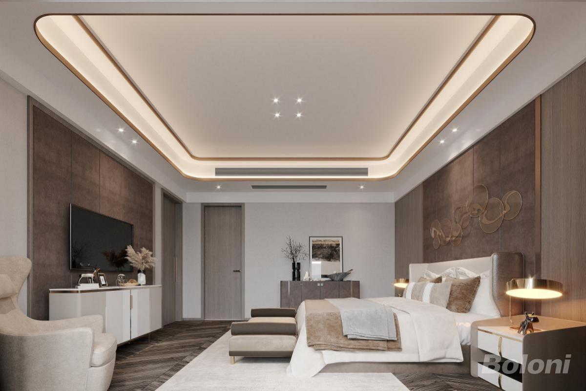 依此大平层格局,萃取轻奢内核:公区以 悬浮顶+金属收边 强化秩序,地面拼花石材呼应家具皮质光泽;私区借绒面、丝光面料柔化氛围,铜质五金点亮细节。低饱和色调串联空间,让「简」的克制与「奢」的质感共生,适配高阶生活场域。