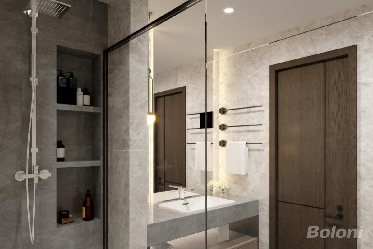 本卫浴萃取轻奢内核:灰调大理石铺陈,天然肌理显矜贵;金属五金(毛巾架、龙头)作精致点缀,嵌入式壁龛藏收纳巧思。镜前灯晕染柔辉,玻璃隔断通透利落,以材质碰撞与细节雕琢,筑就优雅节制的质感场域 。