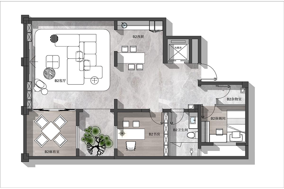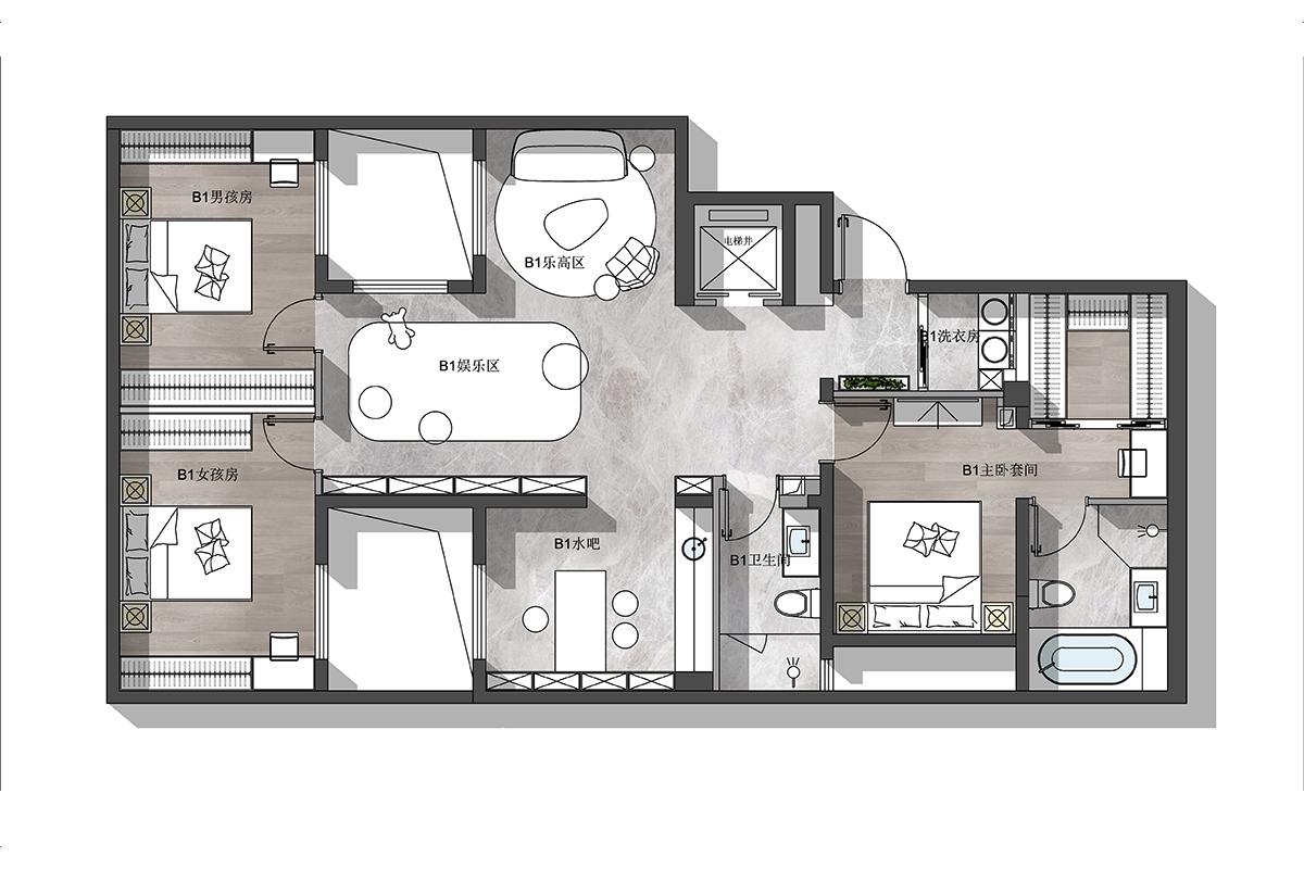 地下层以“隐奢松弛感”为设计锚点,开放娱乐区串联功能模块。大理石肌理打底显奢雅,金属收边勾勒利落边界;木饰面温润嵌套,线性灯与氛围光织就层次。收纳隐于立面,五金细节暗藏精致,让功能与质感共融,营造松弛又矜贵的私享场域 。
