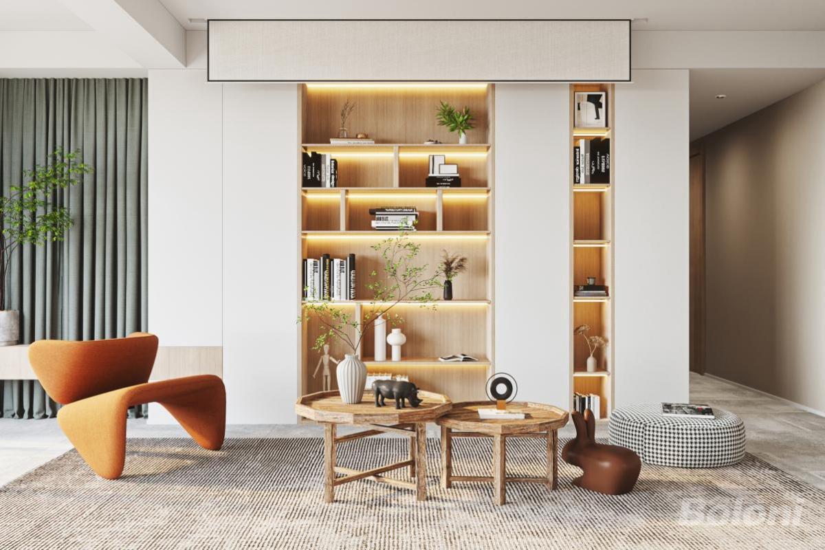 本案以「轻简奢质」为核,浅木色柜体配内嵌灯光柔化空间,冷调白墙与深灰肌理平衡质感。橙色单椅作视觉焦点,木纹家具、格纹墩子糅合自然肌理,软装以绿植、艺术摆件点睛,在极简框架里藏着精致松弛感