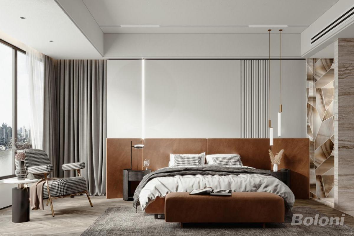 本案以低饱和色调铺陈轻奢卧室基底:焦糖皮质床头作暖调核心,黑金门格纹软装点缀精致,大理石肌理墙与悬浮灯带揉入高级感,人字木地+灰调纱帘柔化空间。轻简线条里藏着材质碰撞,让休憩场域兼具松弛与质感。