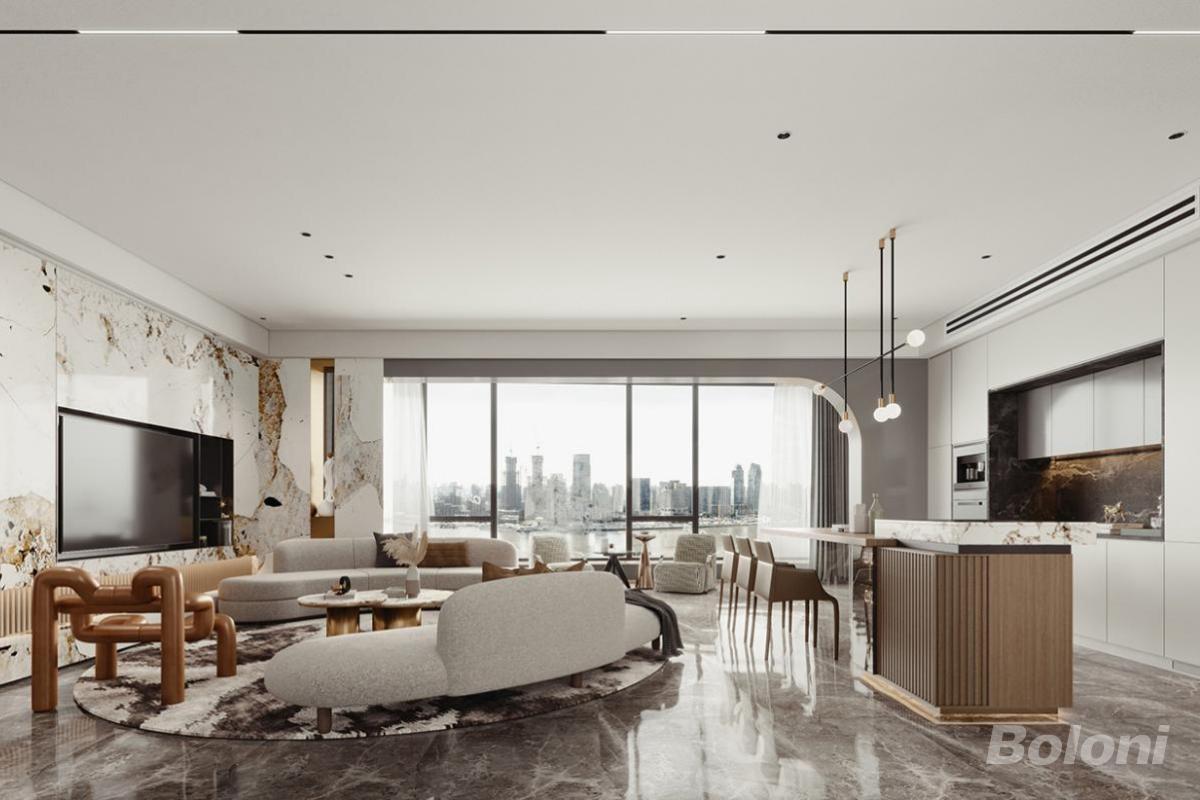 本案以“奢雅通透”构建客餐厨一体空间:金纹大理石墙作质感落点,浅绒弧形沙发柔化线条,木调餐边柜缀鎏金细节,球形吊灯点睛。无主灯+大窗引城景入室,材质碰撞间,让高级感与松弛感在开放布局里自然融合。