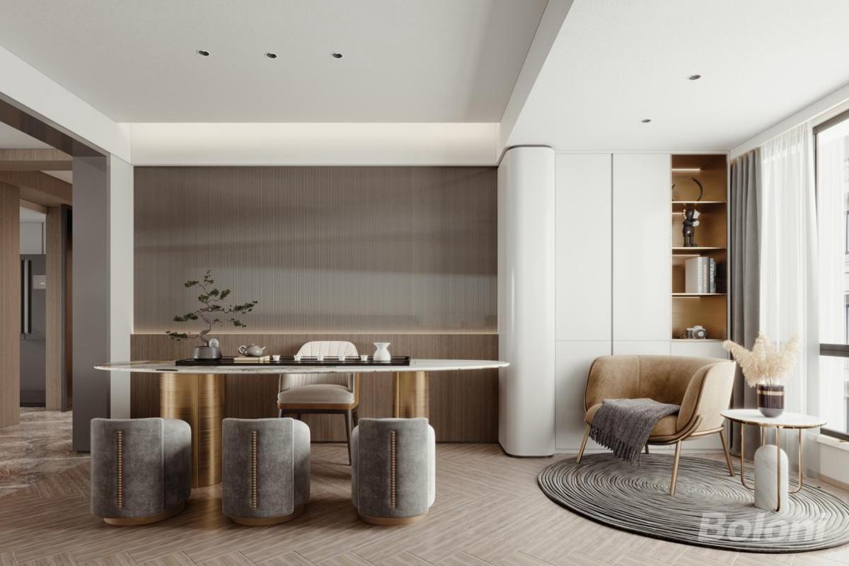 以 “简而有质” 为核心,摒弃冗余装饰。丝绒面料搭配金属线条,天然石材肌理碰撞温润木纹,奠定奢雅基底。利落几何轮廓串联空间,隐藏式收纳与精致五金暗藏巧思。低饱和色调糅合柔和光影,让质感在克制中自然流露,诠释兼具格调与松弛感的现代生活美学
