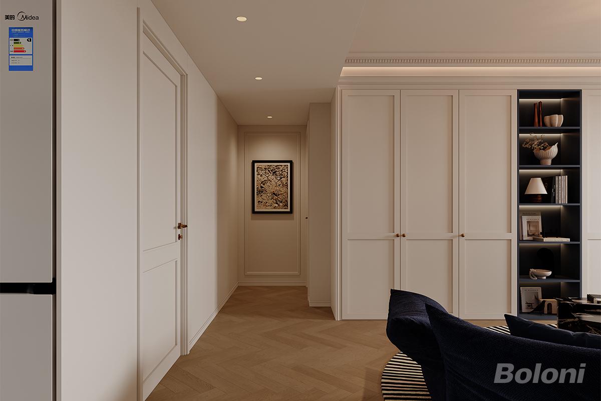 在通往主卧的玄关过道墙做了墙面石膏线加挂画的设计,由于安装了中央空调所以过道做了吊顶,并增加了筒射灯的设计,满足了照明需求,沙发对面的收纳柜做了法式造型门板设计