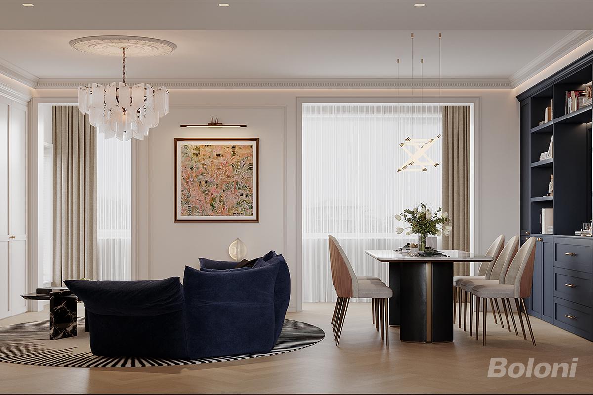 餐厅的区域,由于女业主喜欢在客厅有一个阅读的空间,所以做了餐边柜加书柜结合的设计,在柜子中间做了展示画的空间,增加氛围感