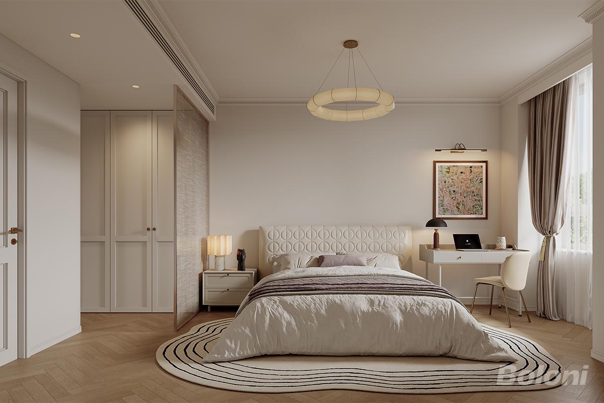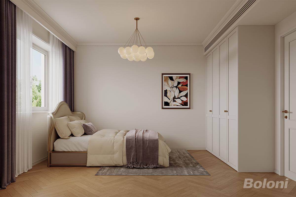 女儿房的设计按照客户需求,床头靠着窗户摆放,地面采用了人字拼地板,柜子做了法式造型门板设计,做了中央空调局部吊顶