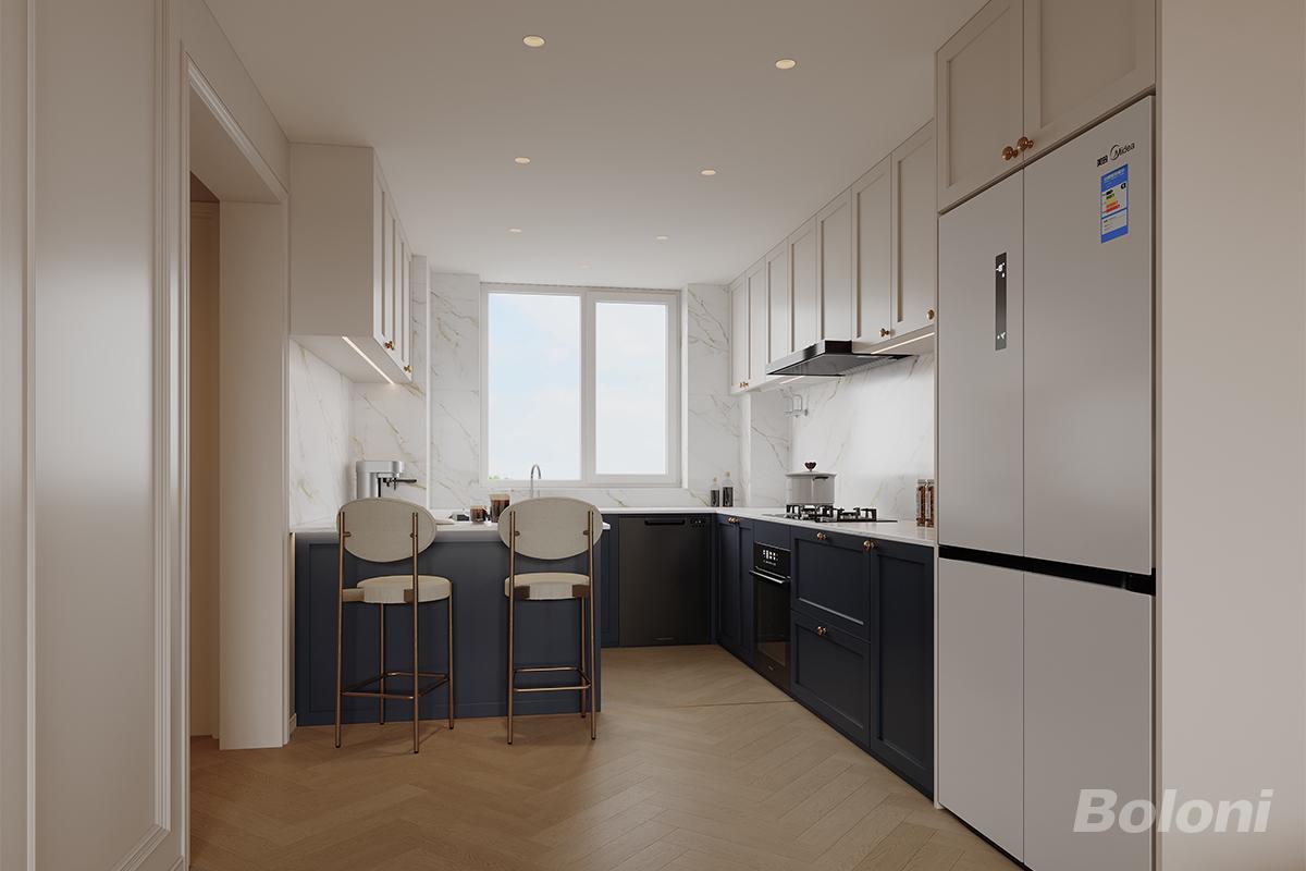 厨房改造成了开放式厨房,并且做了岛台,平时可以在此位置吃早餐,增加了冰箱柜,做了嵌入式蒸烤一体机和洗碗机的设计