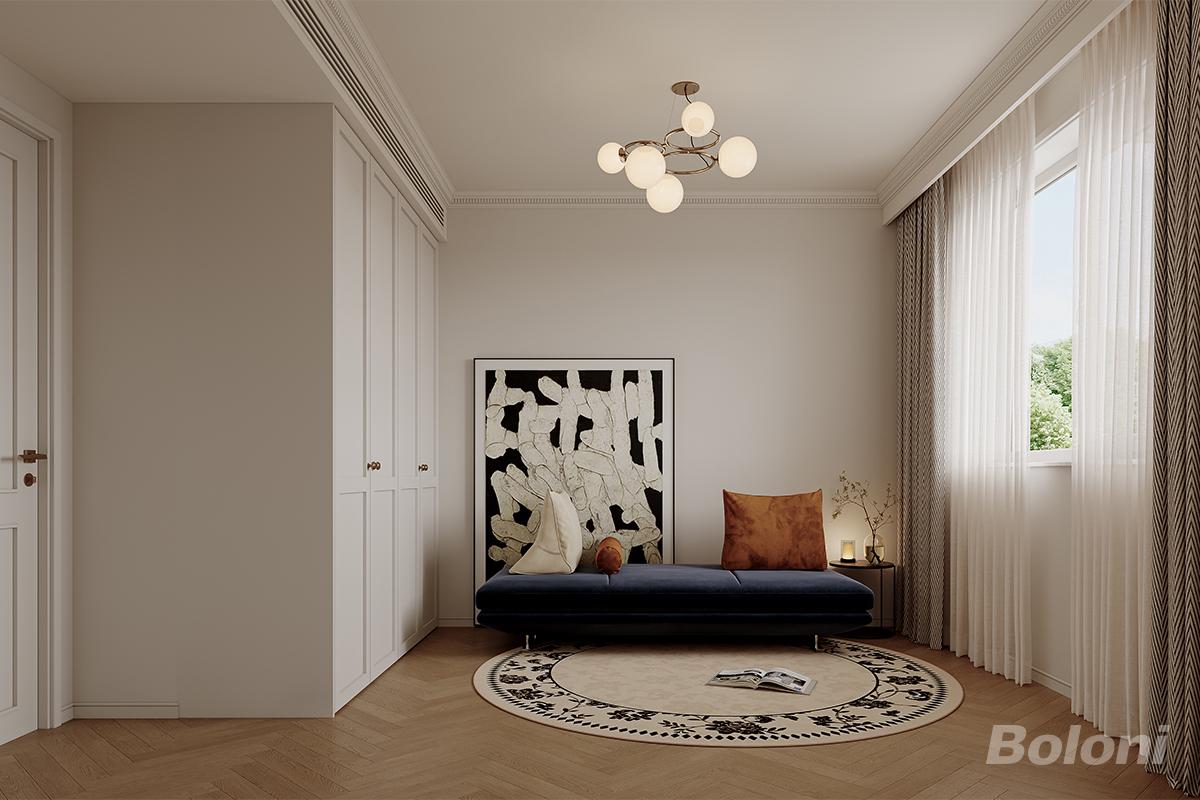 原有的次卧改成了书房,书房了放了衣柜以及折叠沙发,满足了睡眠和阅读休闲的功能,顶上做了法式石膏线顶线和中央空调局部吊顶