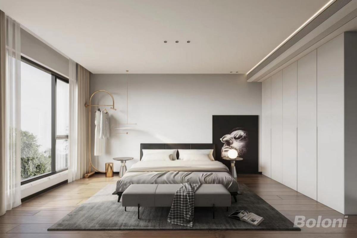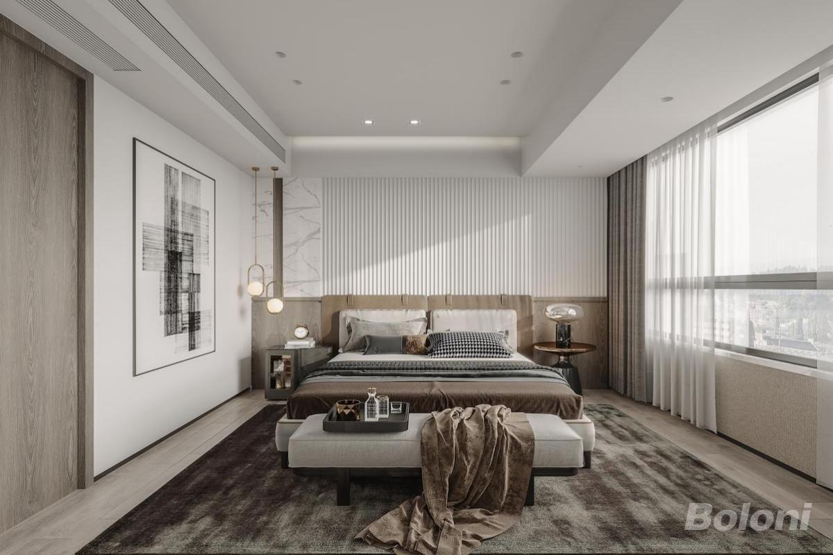 以低饱和大地色为底,皮革床架呼应丝绒披毯,金属吊灯晕染温润光晕。床头波纹板与线性灯勾勒层次,艺术挂画点睛,于极简布局中,借材质肌理与精致陈设,诠释轻奢「静谧隐贵」的休憩场域 。