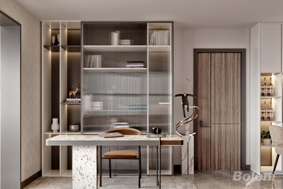 本轻奢书房以玻璃格栅柔化边界,石材桌台碰撞皮革座椅,嵌入式光晕染层次。开放柜体兼顾藏纳与展示,艺术雕塑点睛,借材质肌理与精致陈设,营造「简而显贵」的静谧思考场域 。