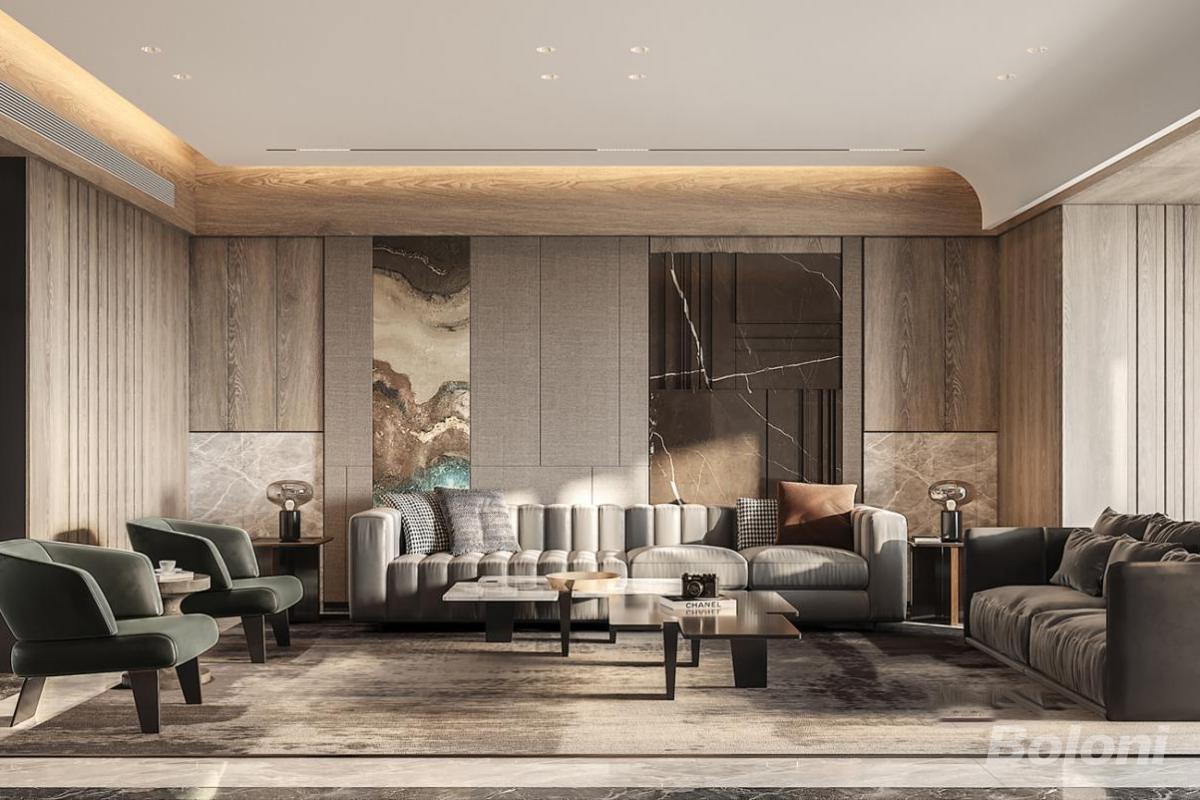 本客厅以木石金棕为基调,大理石背景墙嵌金属线条,木饰面柔化硬朗。皮质沙发、几何茶几呼应秩序,线性光与开放柜体藏纳艺术,于极简布局中,借材质肌理与精致细节,诠释轻奢「隐贵而克制」的气韵 。