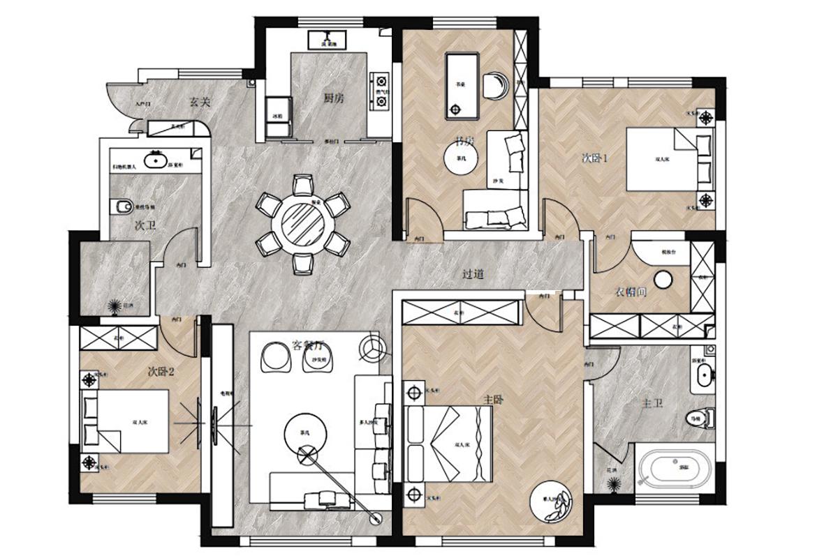 立足本户型通透格局,客餐厅以大理石肌理搭配金属线条,主卧衣帽间融入哑光五金与玻璃细节。低饱和色调糅合古铜金点缀,线性光勾勒轮廓,甄选丝绒、皮革等质感面料,于简约中藏精致巧思,诠释轻奢“优雅不彰”的格调 。