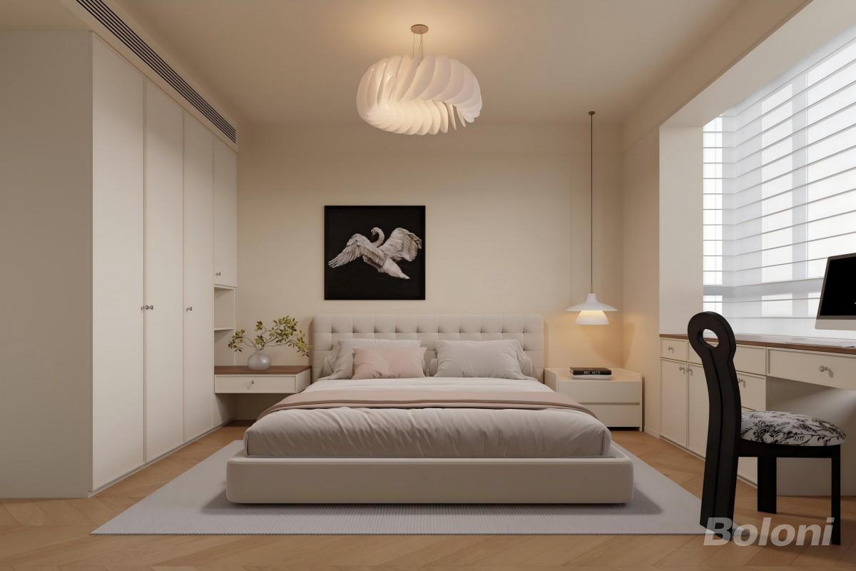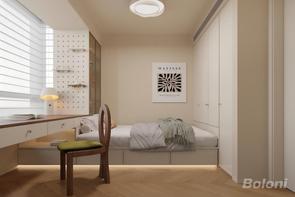 功能分区清晰,睡眠区与学习区(书桌区域)布局合理,空间利用高效且通透,同时通过风格元素的融合,让卧室在统一中充满设计细节。