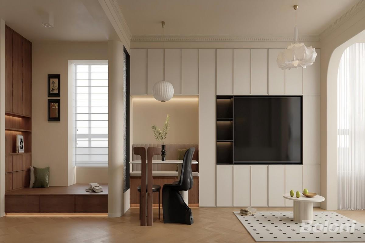 汲取新中式风格的雅致,体现在木质柜体、中式挂画的运用,以及空间布局的层次感营造上。点缀复古与艺术元素,如拱形窗户、造型独特的白色花朵吊灯、黑白色波点地毯,为空间注入个性与艺术感。