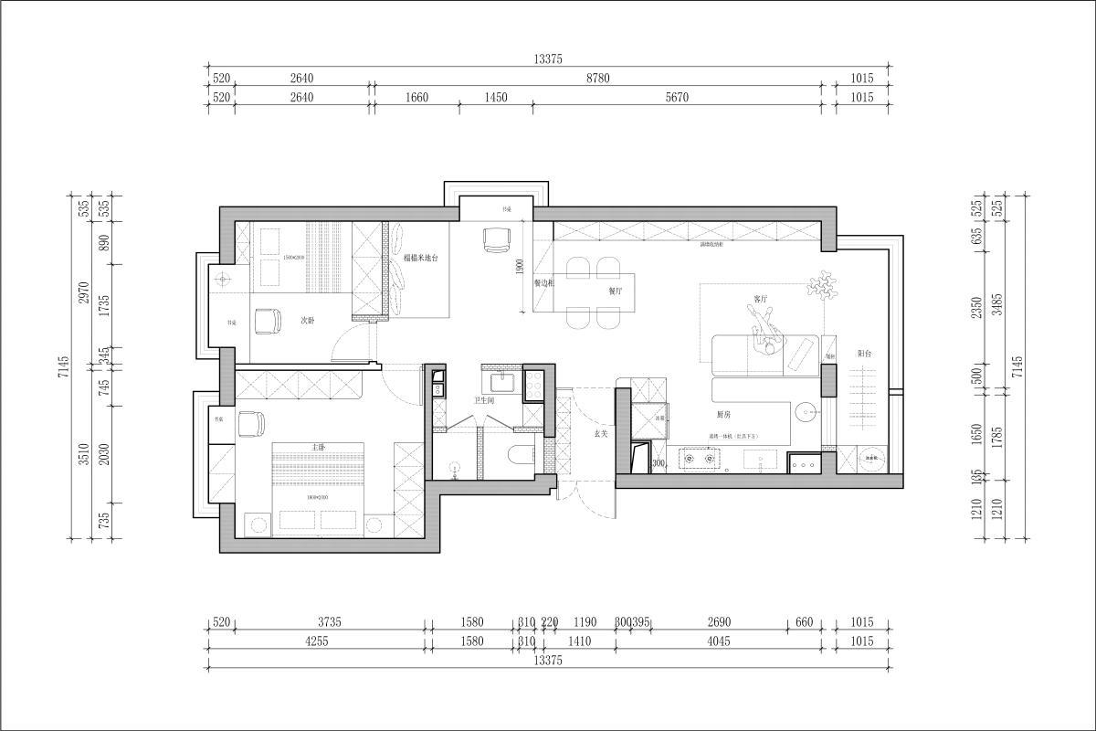 客餐厨区域呈开放式设计,空间通透流畅,功能分区清晰且互动性强,契合现代生活的功能需求与审美趋势,同时通过风格元素的融合,让空间在统一中充满变化。