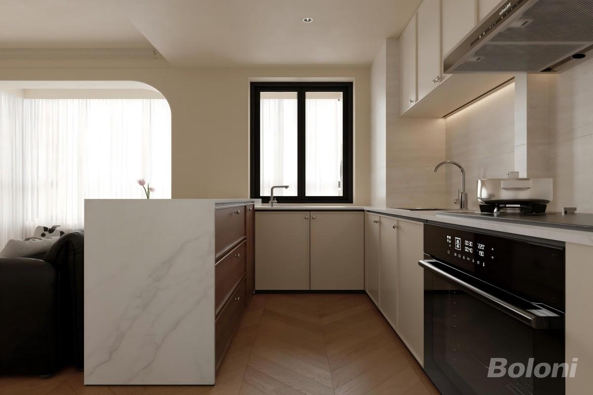 厨房与客区通过吧台自然过渡,形成半开放式布局,既保证了空间的互动性,又划分了功能区域,契合现代生活的功能需求与审美趋势。