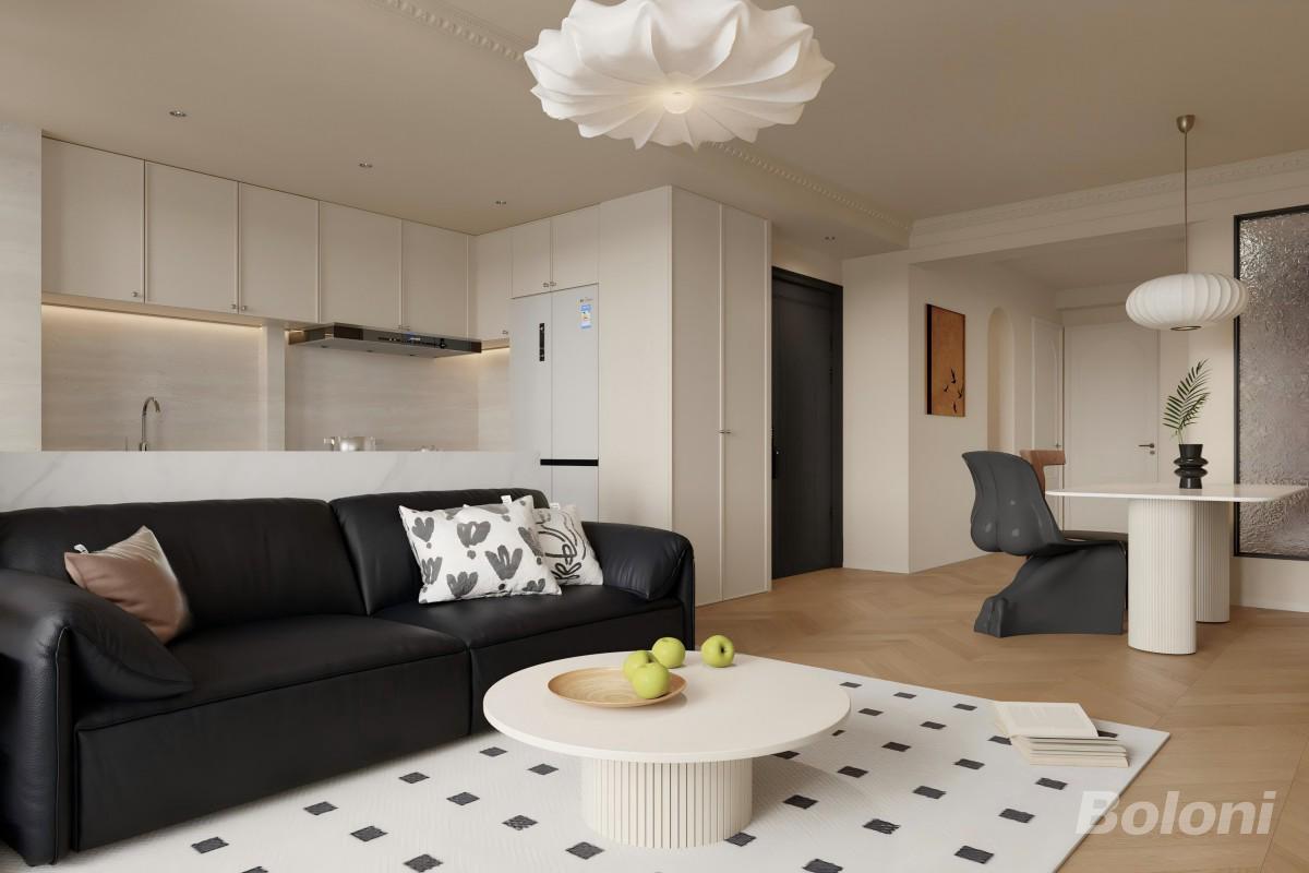 点缀复古与艺术元素,如造型独特的白色花朵吊灯、黑白波点地毯、艺术挂画,为空间注入个性与艺术感。