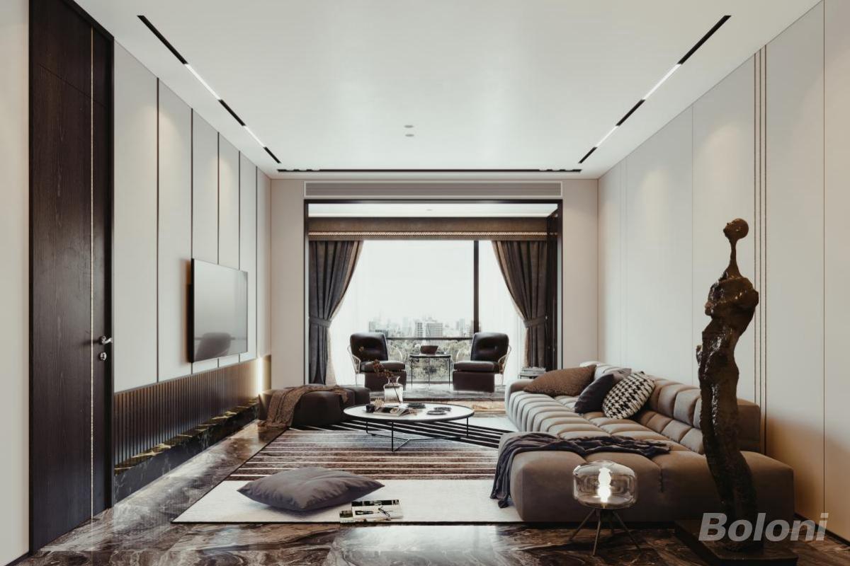 本方案以现代笔法演绎轻奢内核。高级灰主调下,岩板地面与金属线条勾勒出简练骨架。L型沙发与抽象雕塑的刚柔对比,于沉稳秩序中注入艺术张力。设计摒弃浮华,专注材质碰撞与光影层次,借由软装的精奢细节,淬炼出一个兼具舒适度与高级感的当代生活场域。