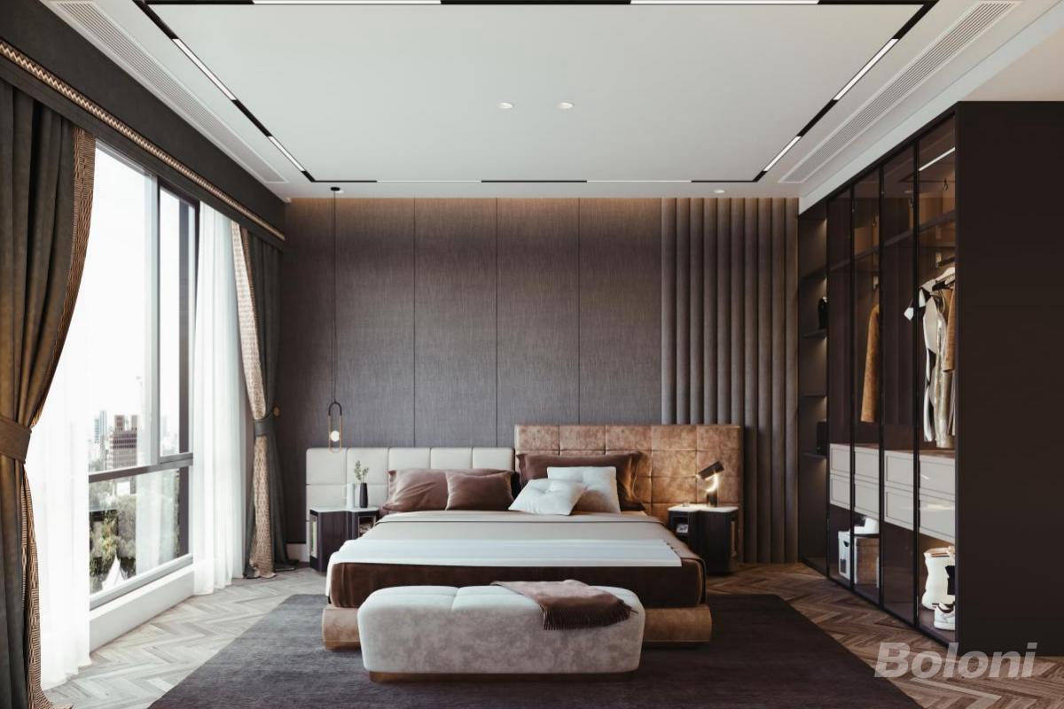 本案聚焦于私密空间的静谧与奢华。设计以深色竖纹背景墙奠定沉稳基调,搭配线性灯光勾勒现代韵律。玻璃与木质结合的衣柜通透而时尚,柔软床具与充沛采光共筑舒适内核。整体摒弃繁复装饰,通过材质的精准配比与光影的细腻层次,于统一色调中演绎出低调、精致且极具包裹感的休憩氛围。