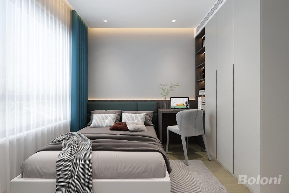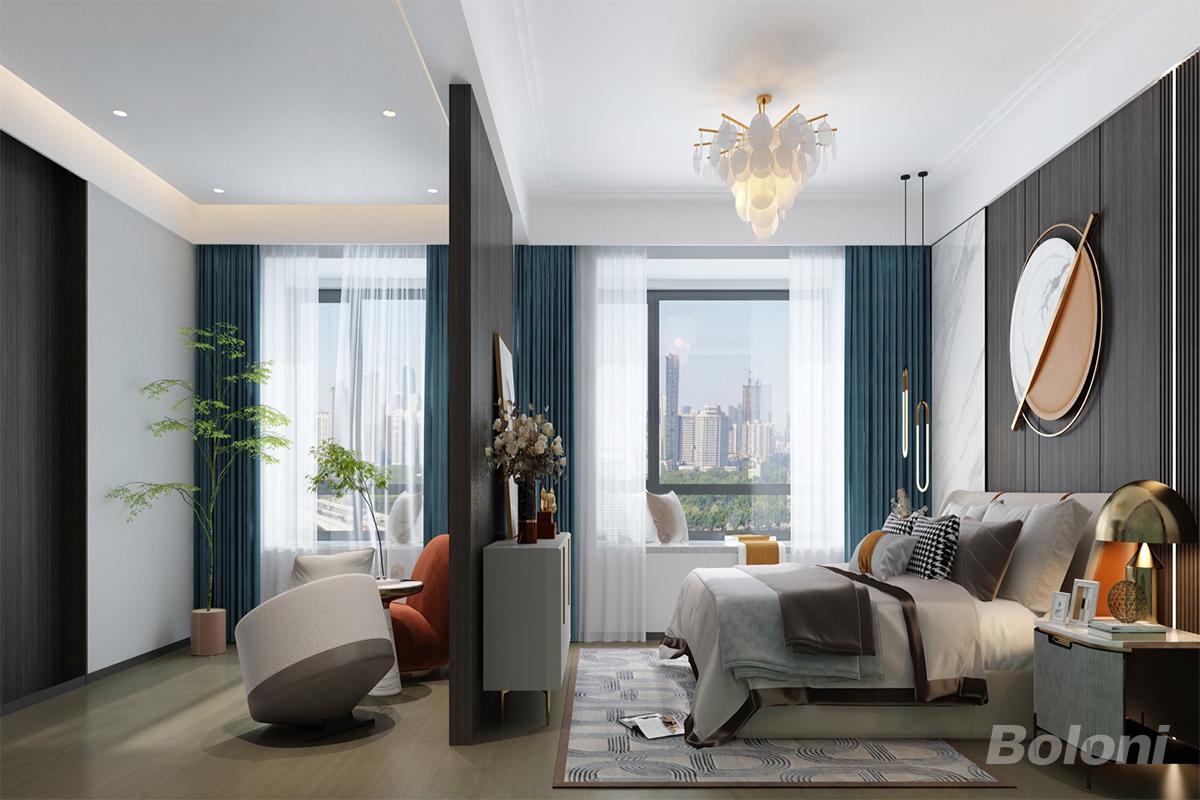 间布局:小空间植入“睡眠+办公”复合功能,床侧定制书桌+开放格,满足临时居住与轻办公需求;通顶衣柜最大化利用垂直空间。材质与色彩:以“浅灰+白+深木”为主,搭配墨绿床头软包、蓝调窗帘,用低饱和色彩提升温馨感;地面选用浅木地板,弱化空间压抑感。灯光与软装:无主灯+床头线性灯,保障阅读照明;软装简约(绿植、条纹抱枕),避免空间杂乱。
