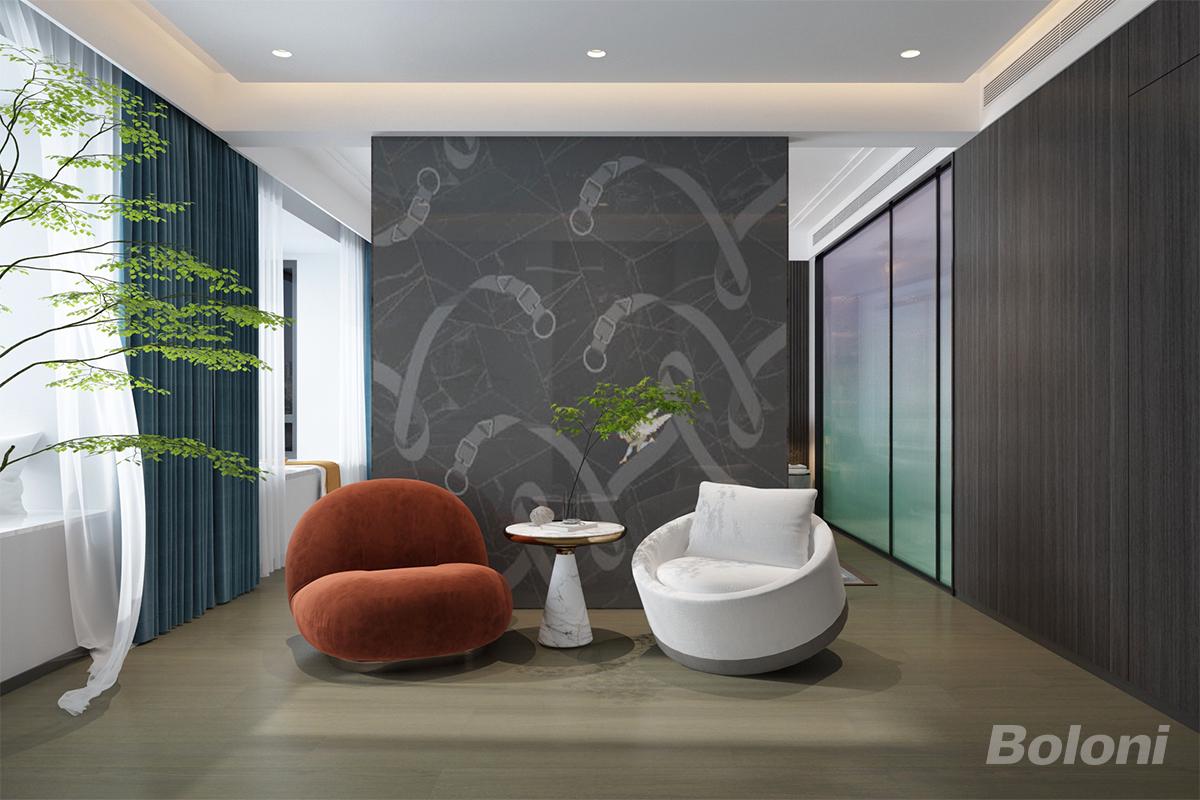 深灰木纹墙、浅灰调地板、白纱+墨绿窗帘,用冷色调奠定沉稳克制的氛围;亮点:焦糖橙绒布椅+奶白软包椅形成柔和撞色,既打破单调,又通过“绒布+布艺”的软质材质统一了温暖质感。材质:软硬+通透的层次平衡 硬质:深灰艺术纹理墙(金属链条图案强化艺术感)、大理石纹边几(精致轻奢)、深色木纹墙板(质感厚重);软质:绒布/布艺家具(弱化硬质冷感);通透:渐变玻璃隔断(保证用隔断划分功能区,保障休憩隐私。