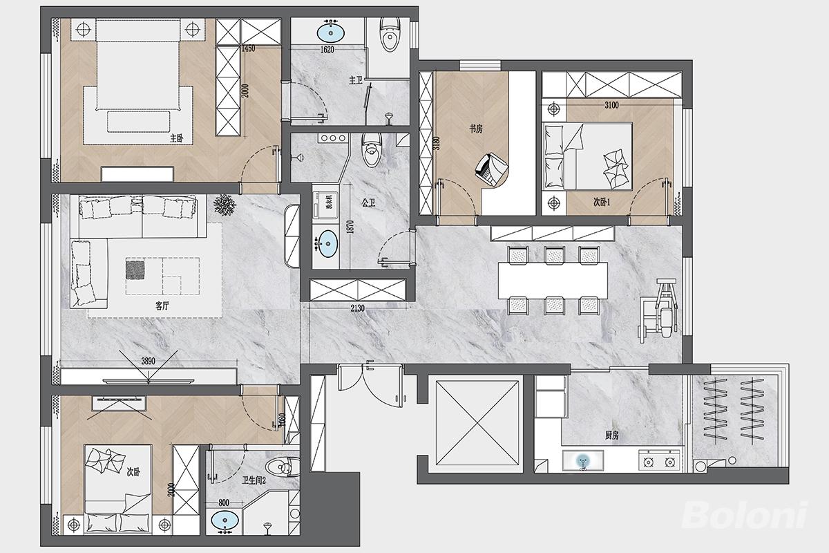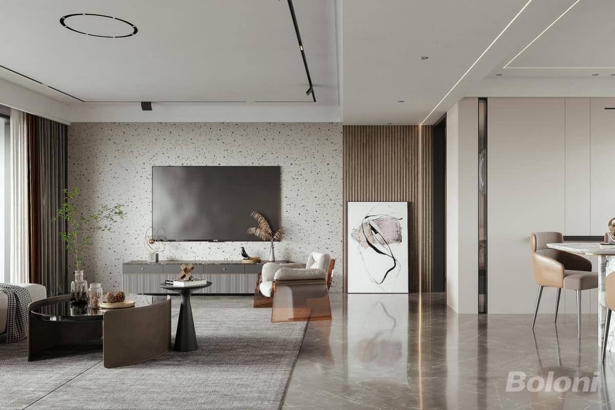 本设计以低饱和色调为底,水磨石肌理碰撞金属线条,木纹格栅柔化硬朗。几何家具混搭透明椅,艺术挂画与精致摆件点睛。借开阔格局与材质层次,在简约中凝萃优雅克制的轻奢气韵 。